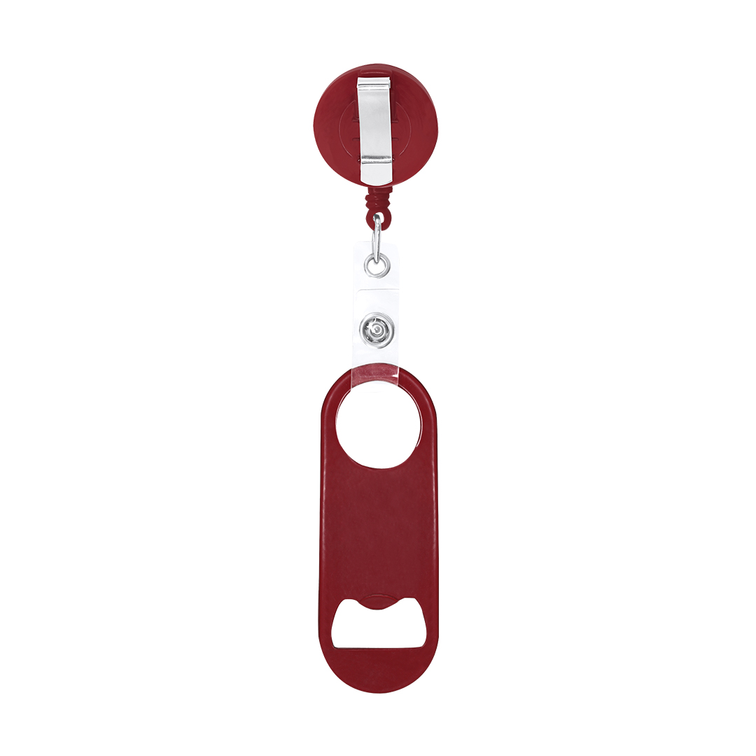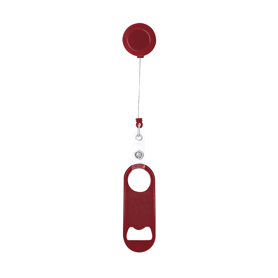 Abridor de Acero con acabado metálico brillante. Un extremo con abridor de botellas y en el extremo opuesto con orificio circular unido a través de cierre a presión a un soporte retráctil de 65 cm con clip. Práctico y funcional, permite llevarlo colgado para evitar pérdidas. Su cierre desmontable ofrece la opción de usar únicamente el abridor o de engancharlo por separado a un lanyard.