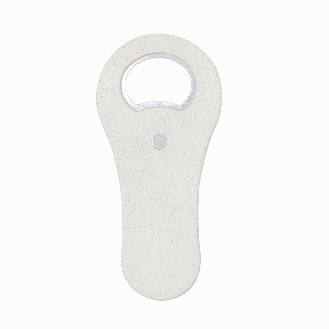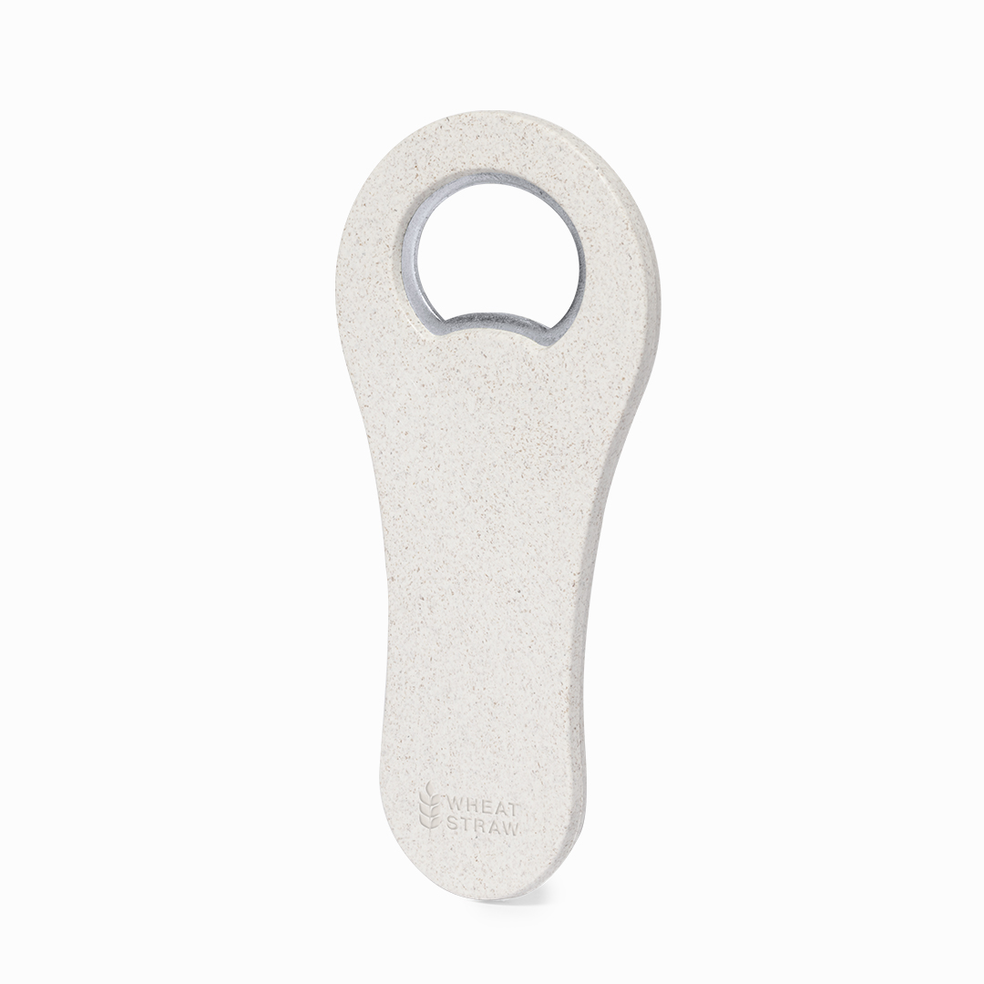 Abridor de botellas fabricado en caña de trigo. Cuenta con un imán que permite adherirlo a cualquier superficie metálica. Presentado individualmente en bolsa de papel reciclada. La caña de trigo fomenta la utilización de materias primas naturales, reduciendo así las emisiones contaminantes.