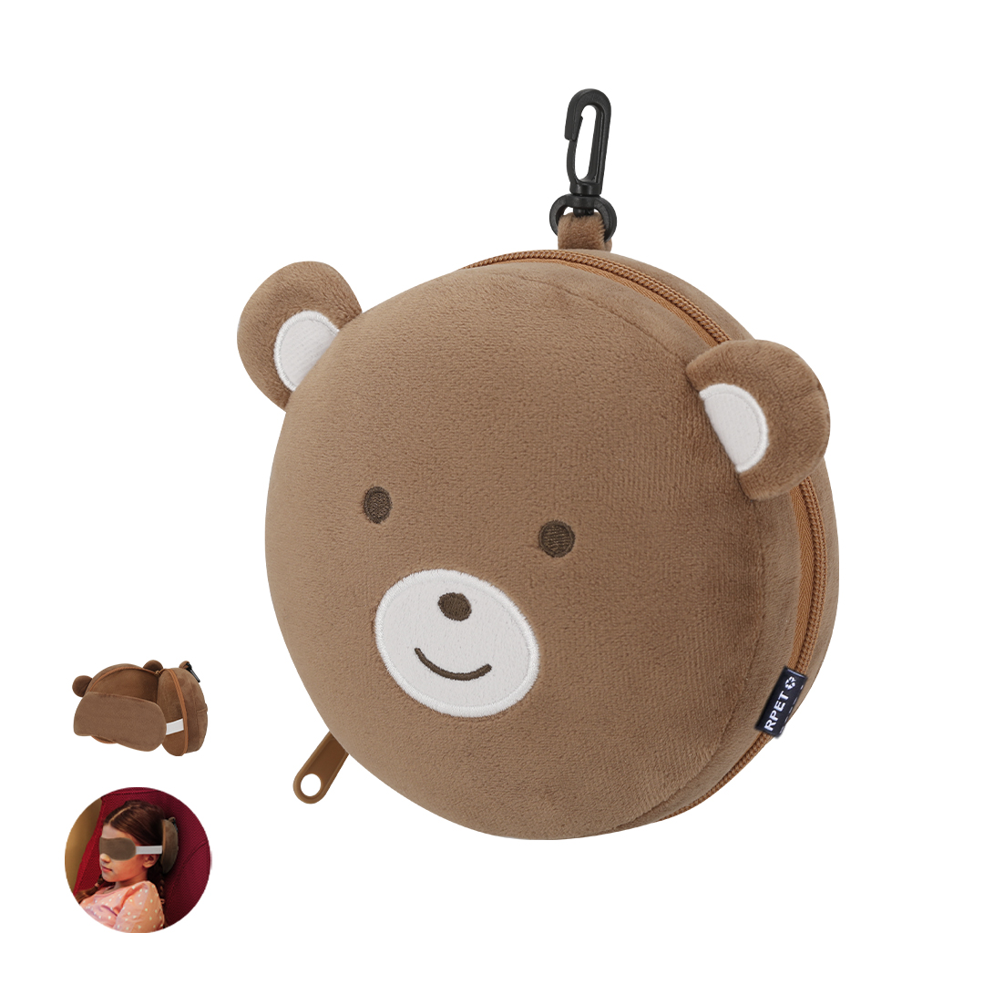 Almohadilla Infantil con Antifaz ideal para viajes fabricada en suave material RPET.Incluye antifaz interior adaptable mediante dos gomas elásticas para mayor comodidad y descanso durante el viaje. Cuenta con un esponjoso reposacabezas plegable con cierre de cremallera, lo que facilita su almacenamiento. Además, dispone de práctico bolsillo exterior y mosquetón de plástico en color negro, que permite transportarlo de manera cómoda.Este accesorio combina funcionalidad, diseño compacto y un toque divertido, siendo perfecto para acompañar a los niños en sus viajes.El material RPET se elabora a partir de plástico reciclado, para así fomentar la reutilización de residuos plásticos y ayudar a la sostenibilidad del planeta.