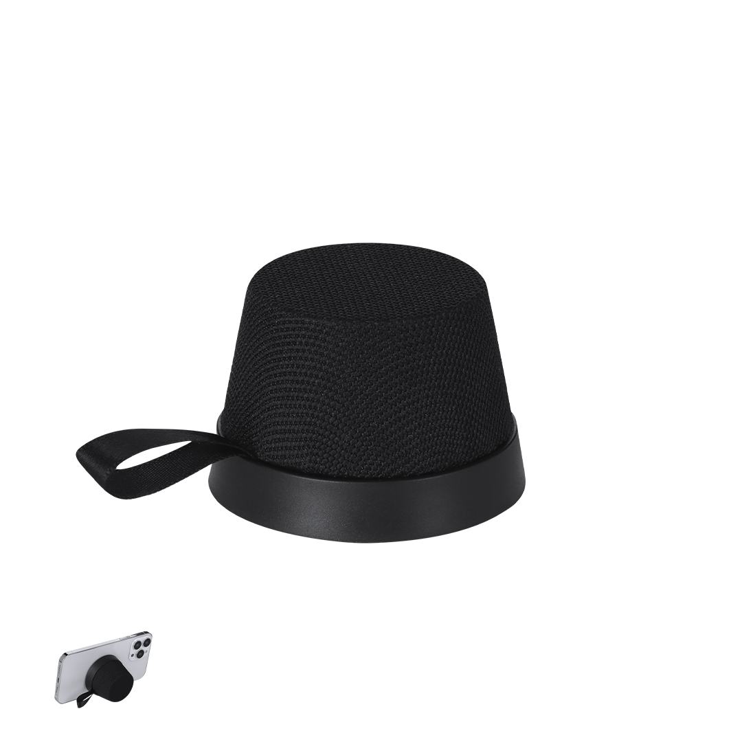 Altavoz Bluetooth® de 3W con enganche magnético fabricado en Poliéster RPET. Soporte magnético para ponerlo en la parte trasera de tu smartphone. Incluye asa en poliéster para fácil transporte. Conexión Bluetooth 5.3, cable de carga en tipo C.