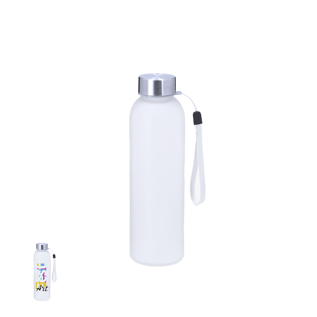 Bidón de 500 ml de capacidad, ideal para marcaje en sublimación. Cuerpo fabricado en cristal acabado frosted y tapón de acero inox libre de BPA. Incluye práctico cordón de para transporte.
