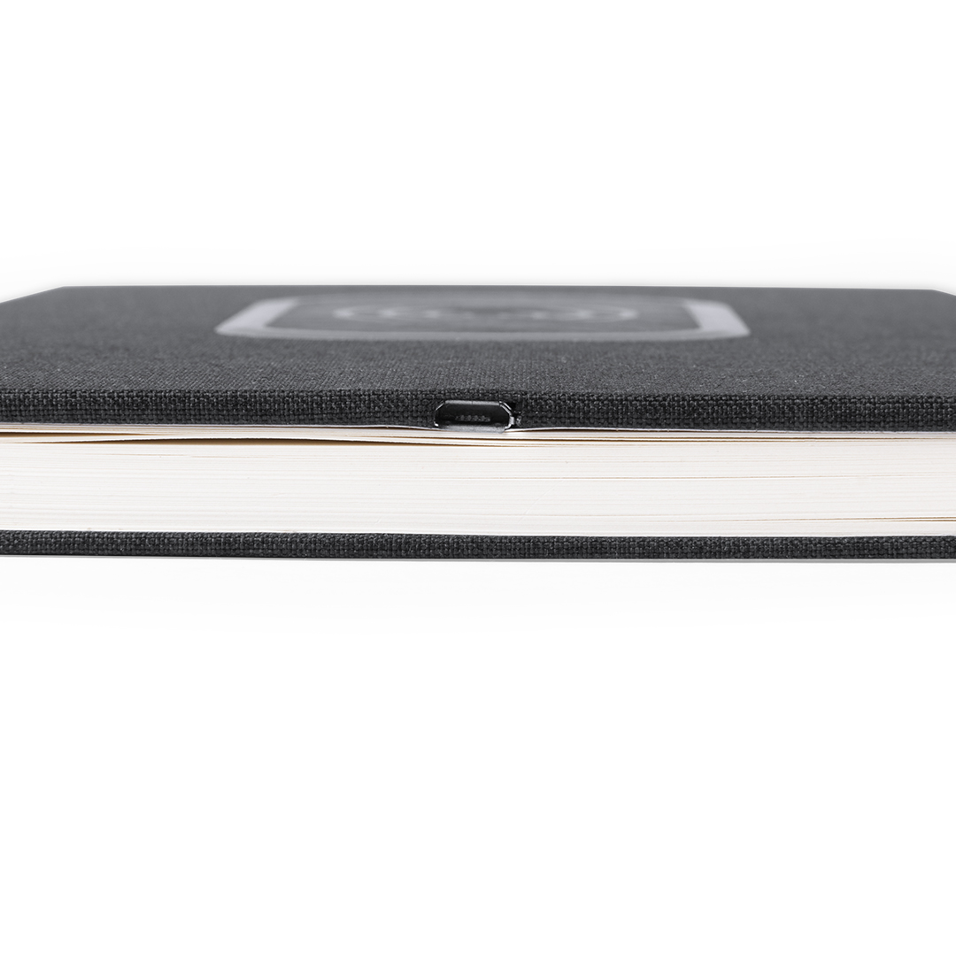 Bloc de notas cargador en resistente poliéster 300D con cargador inalámbrico integrado. De sobrio diseño y original estación de carga en la portada. Incluye 80 hojas con disposición a una raya.