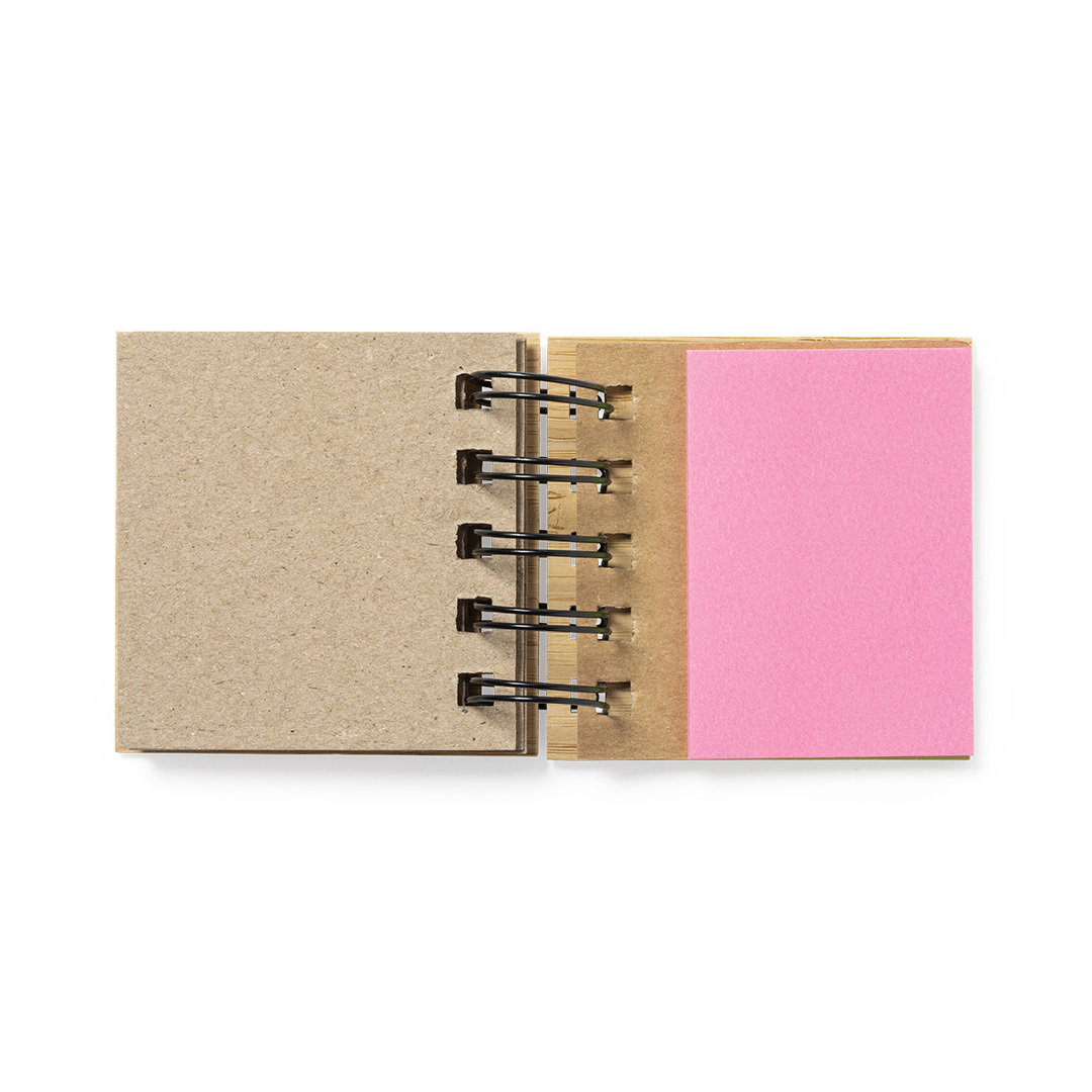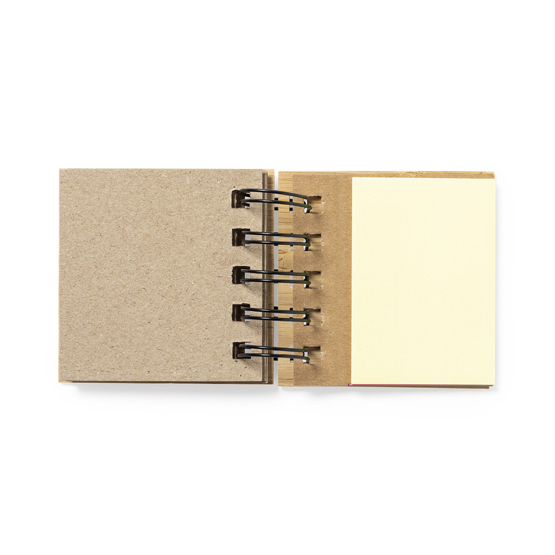 Bloc de notas de anillas de linea nature, con tapas rígidas de bambú. Con 75 notas adhesivas medianas y 125 mini notas adhesivas.