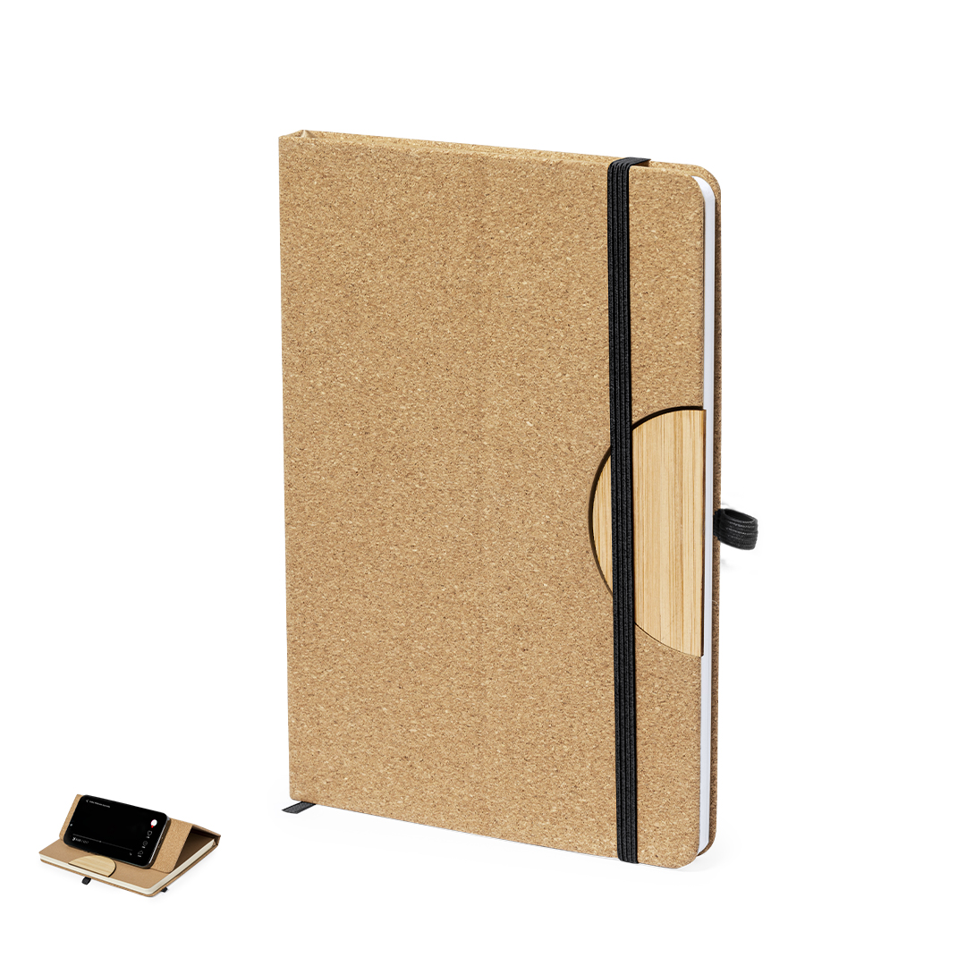 Libreta soporte con tapas rígidas fabricadas en corcho, con versátil soporte integrado en la portada para smartphone y tablet en bambú. Cuenta con elástico de cierre y soporte para bolígrafo a juego de color negro. Contiene 100 hojas interiores de disposición a una raya. Presentada en bolsa individual reciclada.Elaborado con elementos vegetales para así fomentar la utilización de materias primas naturales y reducir las emisiones contaminantes.
