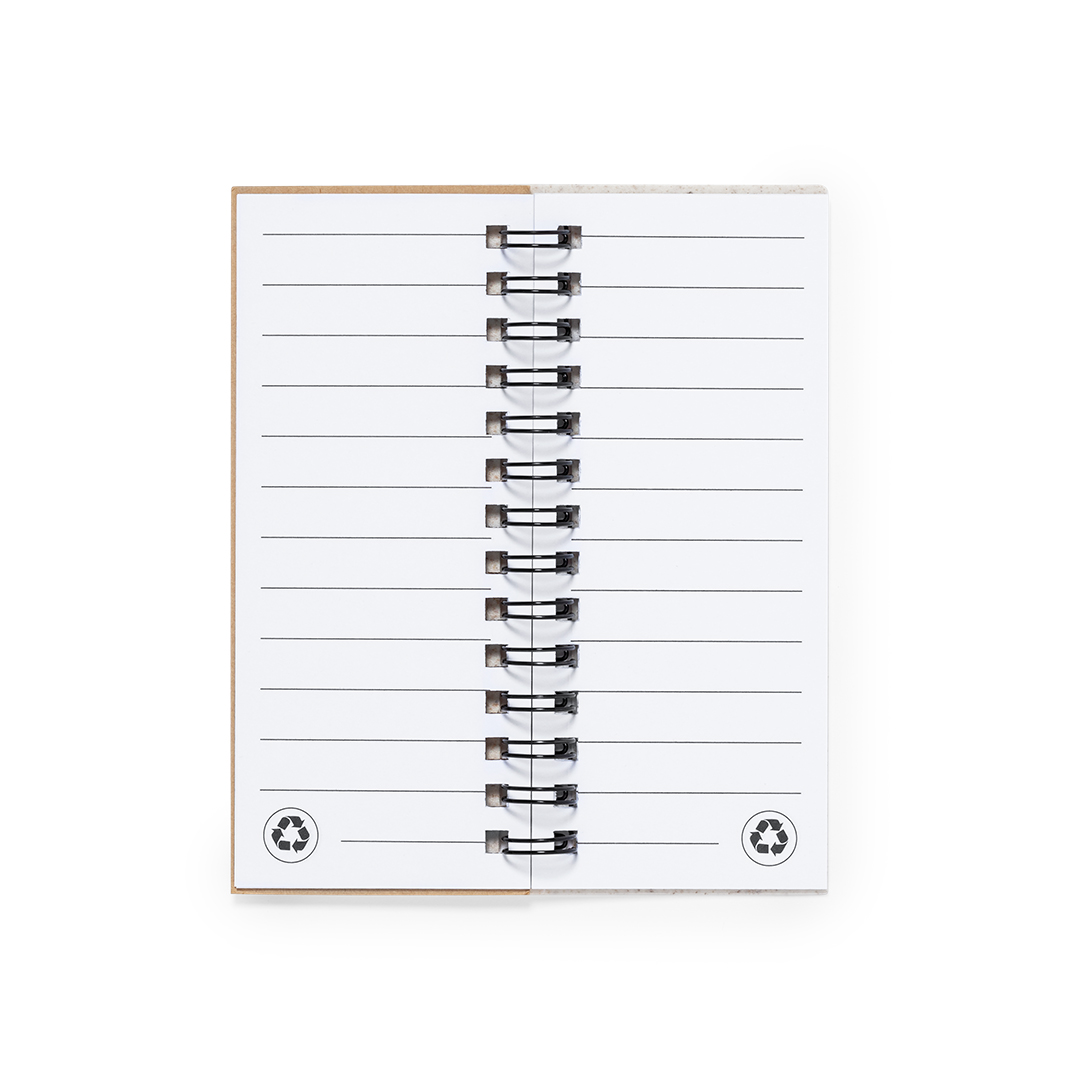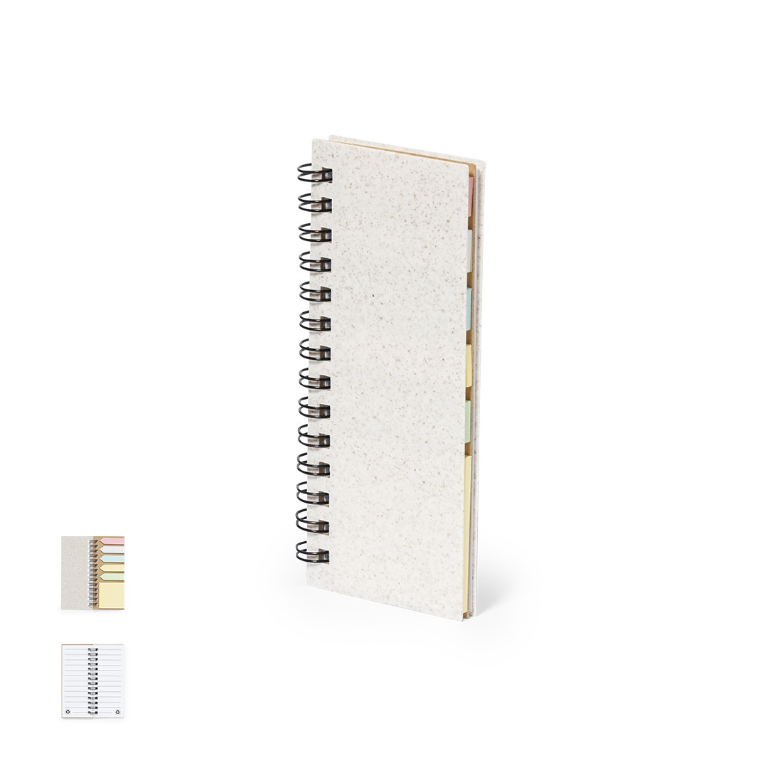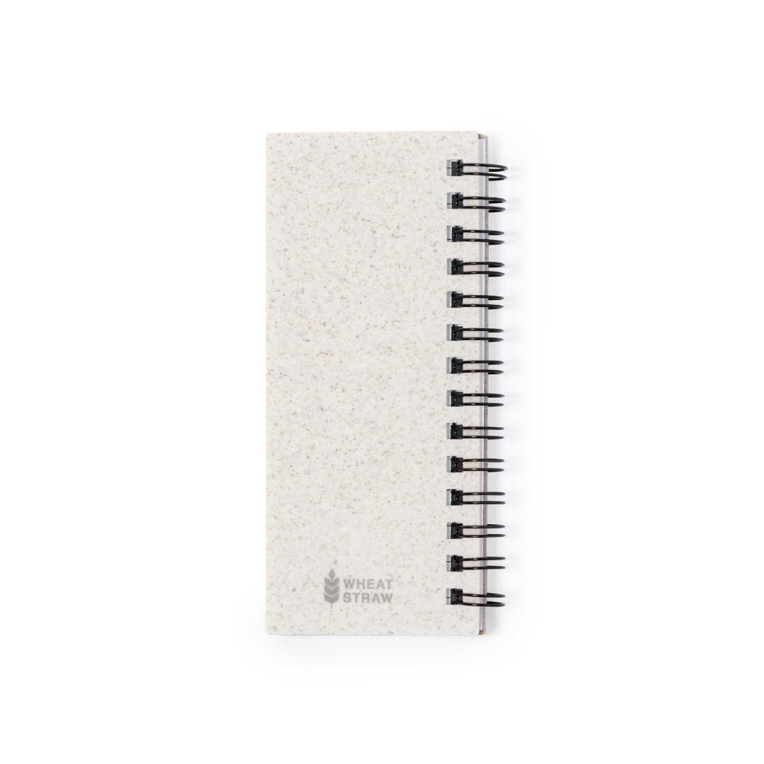 Bloc de notas con tapas en fibra de trigo. Con distintivo wheat straw en la contraportada. Incluye:Bloc de anillas de 30 hojas blancas con disposición a una raya y distintivo reciclado por ambas caras.25 notas adhesivas medianas.125 mininotas adhesivas en varios colores. Elaborado con elementos vegetales para así fomentar la utilización de materias primas naturales y reducir las emisiones contaminantes.Presentado en bolsa individual reciclada.