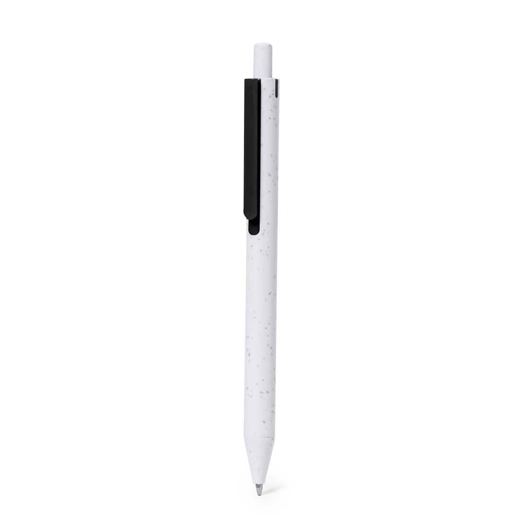 Bolígrafo de mecanismo pulsador fabricado en ABS reciclado. Con clip en vivos colores y cuerpo de suave acabado en color blanco sólido. Distintivo ABS reciclado en la parte superior del bolígrafo. En tinta azul.