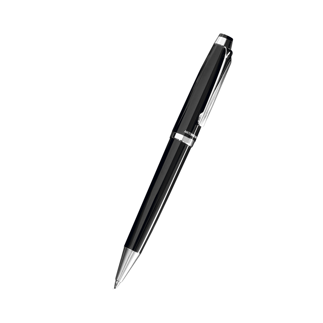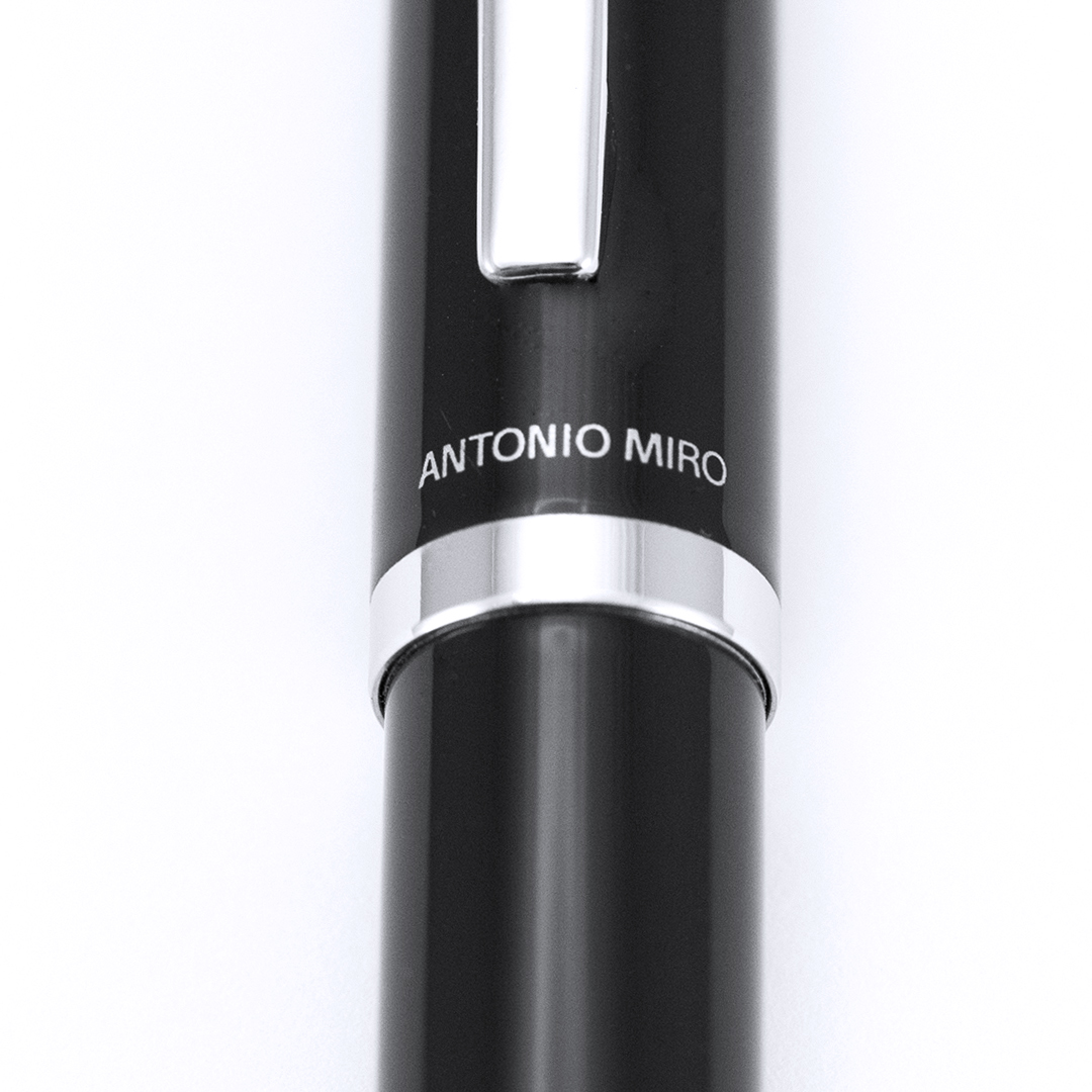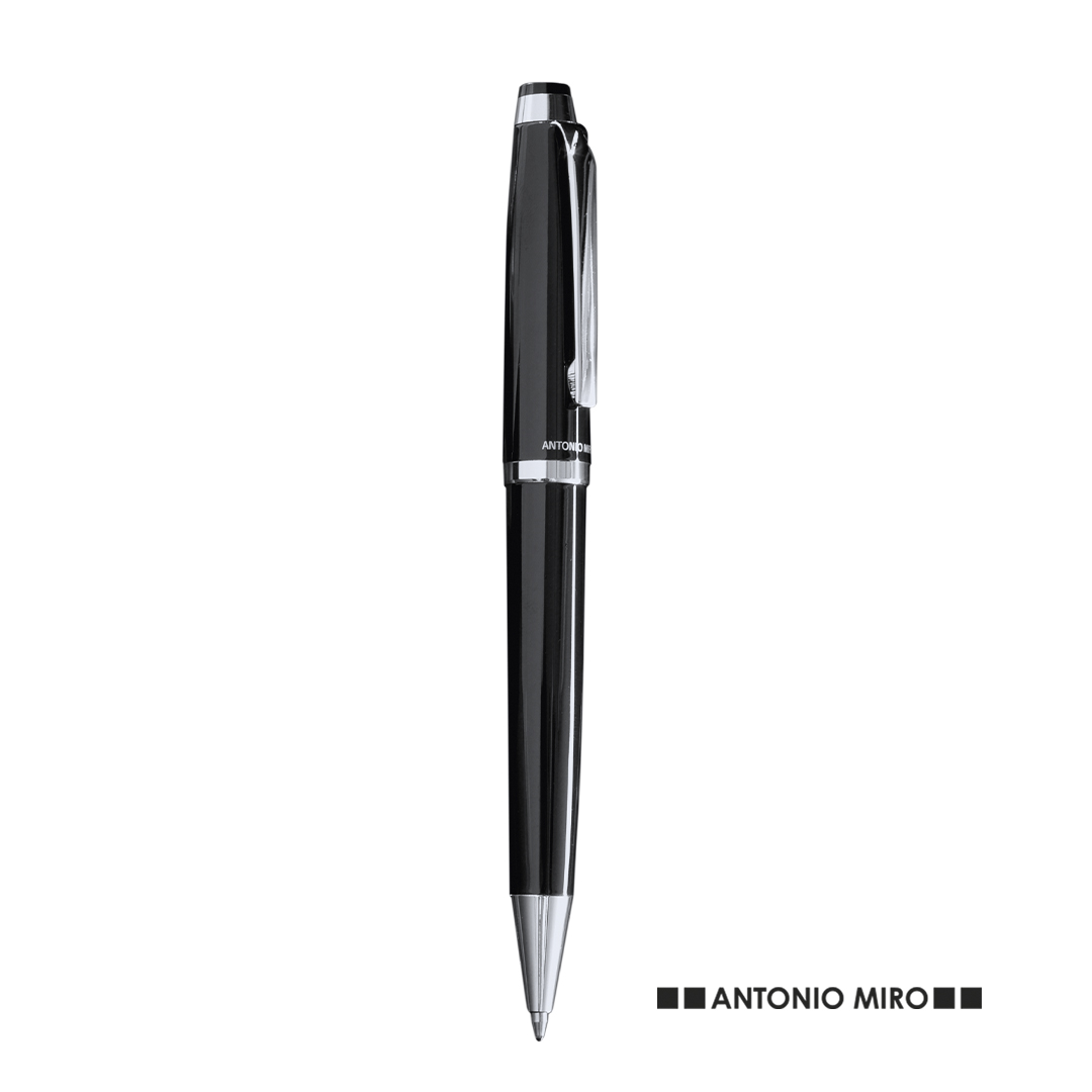 Bolígrafo de Antonio Miró en elegante diseño bicolor y suave cuerpo metálico en sobrio color negro. Con logotipo de la marca encima de la anilla, clip y punta en acabado plateado brillante. Presentado en estuche individual en color negro con logotipo de la marca. De cartucho jumbo con tinta azul.