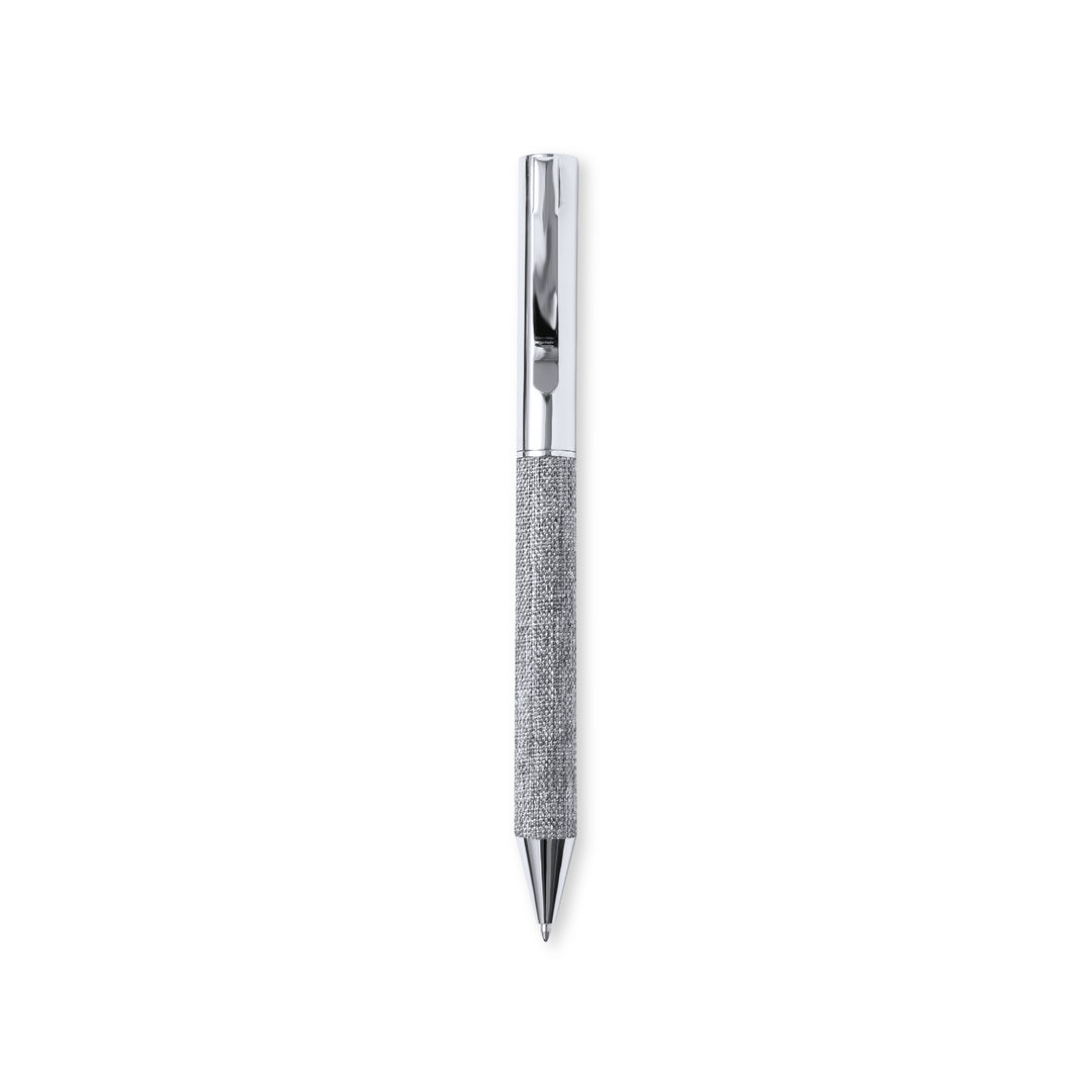 Bolígrafo fabricado en metal cromado y con cuerpo recubierto en poliéster RPET, elaborado a partir de plástico reciclado para así fomentar la reutilización de residuos plásticos y ayudar a la sostenibilidad del planeta. Elegante clip metálico y accesorios a juego, de mecanismo giratorio y en tinta azul. Con distintivo RPET en cuerpo y presentado estuche kraft con funda a juego.