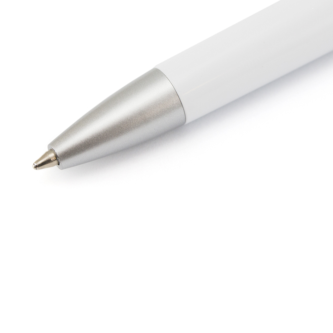 Bolígrafo de mecanismo pulsador de atrevido diseño tricolor con accesorios en vivos colores y cuerpo de suave acabado en color blanco sólido. Con original clip curvado a juego y cómoda empuñadura. Tinta azul.