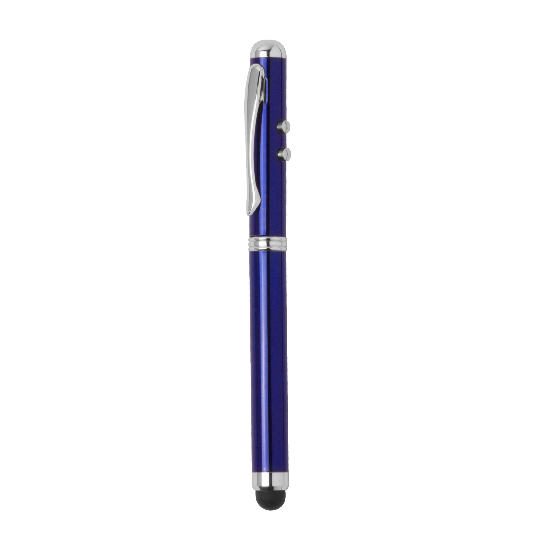 Bolígrafo láser metálico en elegante acabado brillo, con pulsadores de activación laterales para funciones láser y linterna (pilas de botón incluidas). En tinta azul, con puntero táctil integrado, cierre de capucha y clip cromado. Especialmente diseñado para marcaje en láser. Presentado en un elegante estuche metálico en caja individual de cartón de acabado plateado. Interior en suave esponja troquelada, con pilas de recambio.