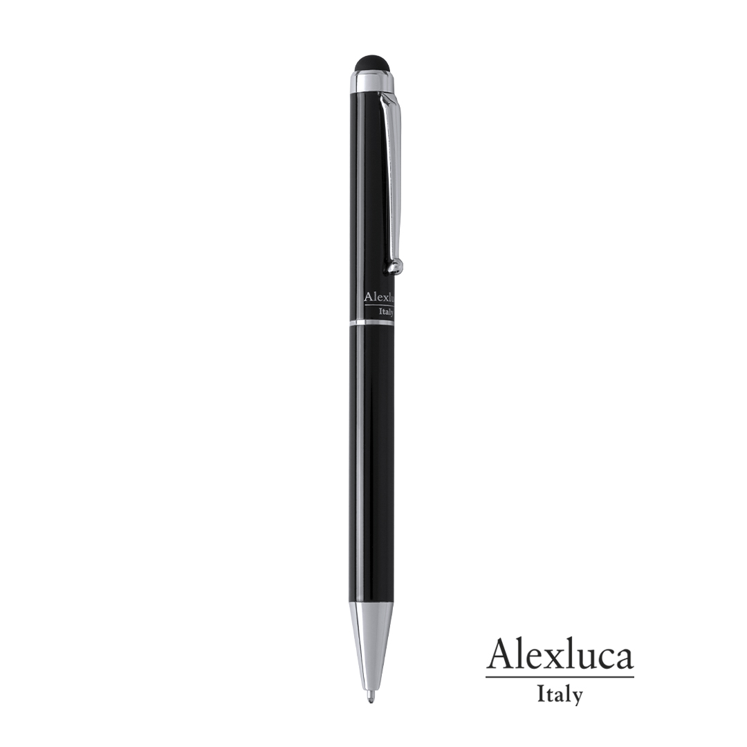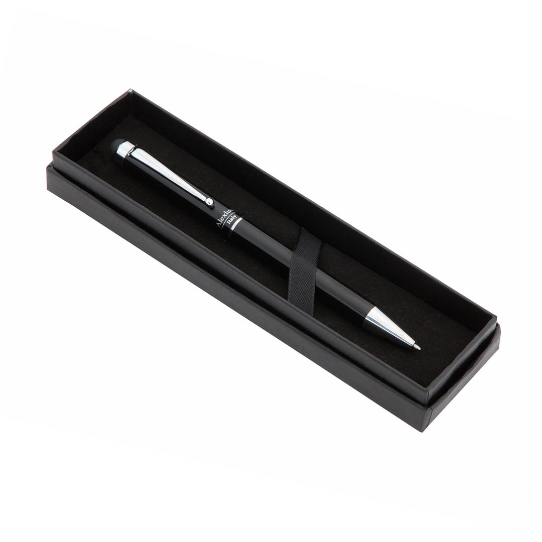 Bolígrafo puntero de Alexluca de mecanismo giratorio con suave cuerpo metálico de elegante color negro. Clip y punta de diseño a juego. Presentado en estuche individual negro con logotipo de la marca. Tinta azul.