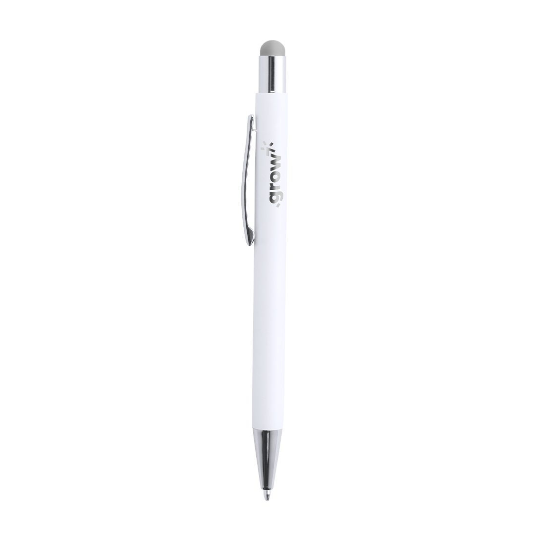 Bolígrafo puntero de mecanismo pulsador con cuerpo de aluminio en elegante color blanco mate. Puntero en variada gama de colores, a juego con el color del interior y con detalles cromados. Recubrimiento exterior especialmente diseñado para marcaje en láser, con el que conseguirá que su publicidad o marca quede perfectamente grabada en color a juego con el del interior. Con cartucho jumbo y tinta azul.