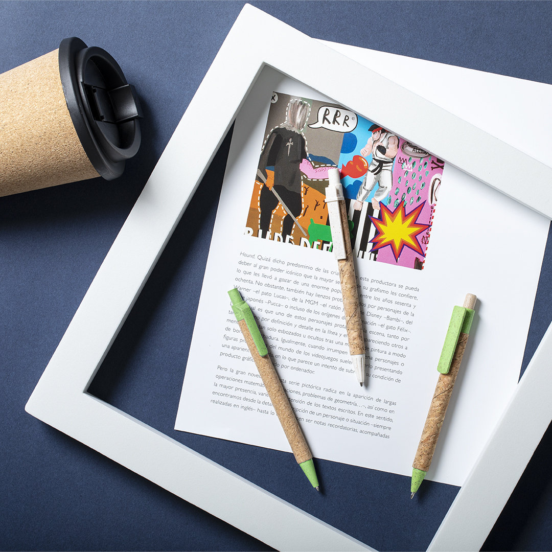 Bolígrafo de línea nature con mecanismo pulsador. Combinación de cuerpo en corcho natural y accesorios en caña de trigo y ABS , para así fomentar la utilización y reciclado de materias primas, reduciendo así las emisiones contaminantes. Disponible en variada gama de colores, con tinta azul. Distintivo Wheat Straw en la parte superior del bolígrafo.