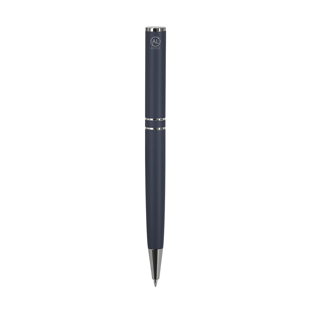 Bolígrafo con mecanismo de giro, fabricado en Aluminio Reciclado. Cuerpo con acabado mate. Incluye accesorios cromados y clip a juego. Carga jumbo y tinta azul. . Incluye distintivo Aluminio reciclado.