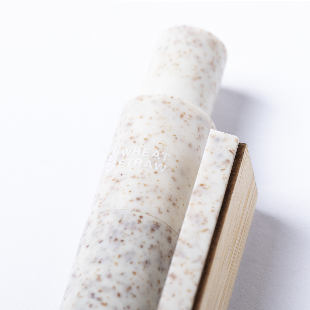 Bolígrafo de línea nature y mecanismo pulsador. Cuerpo fabricado en combinación de caña de trigo y clip en bambú, para así fomentar la utilización de materias primas naturales y reducir las emisiones contaminantes. Clip con amplia zona de marcaje y en tinta azul. Distintivo caña de trigo en la parte superior del bolígrafo.