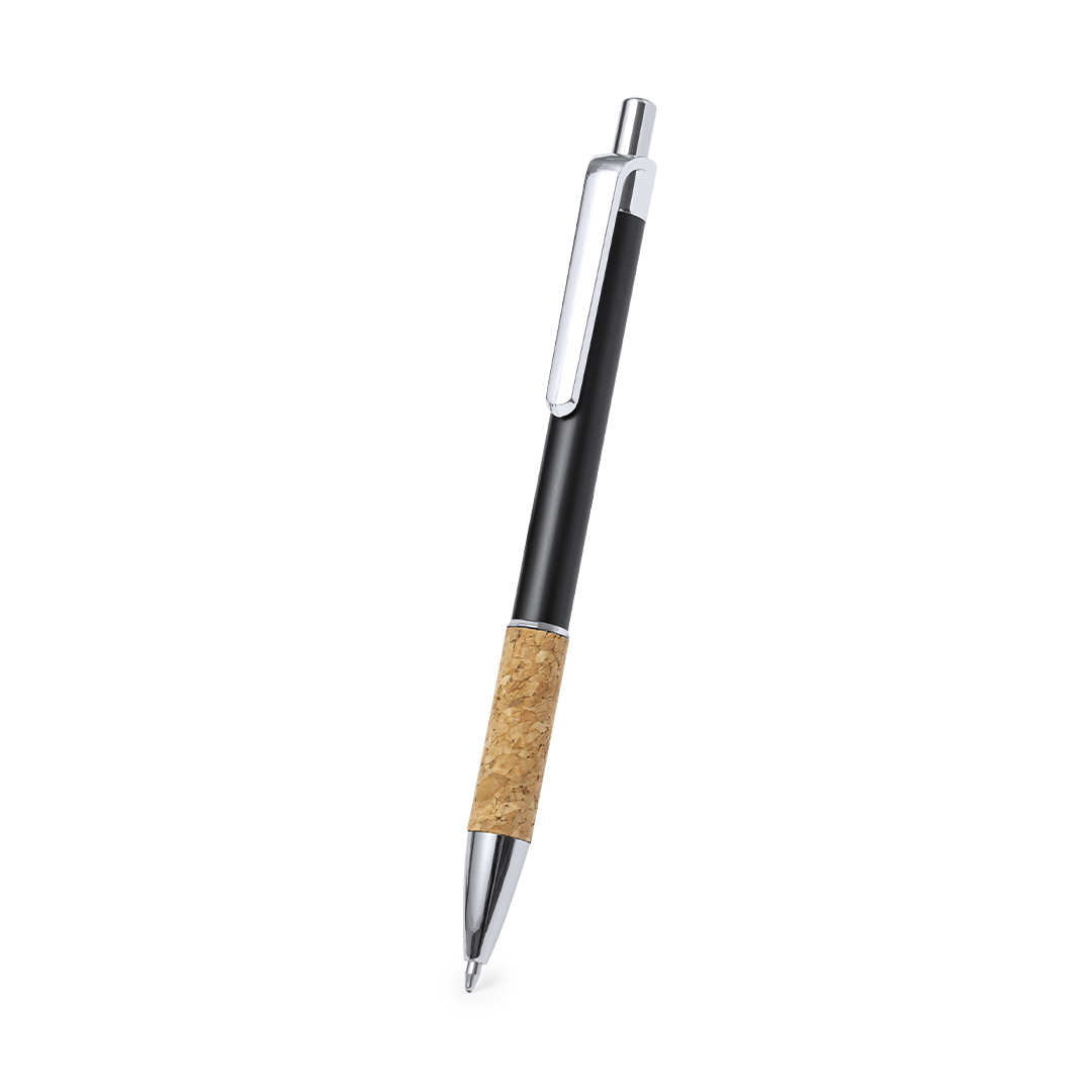 Elegante bolígrafo de corcho y aluminio con mecanismo pulsador. Cuerpo en resistente aluminio de acabado brillante y empuñadura en corcho, con la caña en una amplia gama de distintivos colores. Clip metálico, y en tinta azul. Presentado en bolsa individual reciclada.Elaborado con elementos vegetales para así fomentar la utilización de materias primas naturales y reducir las emisiones contaminantes.