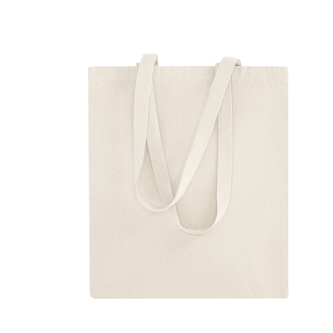 Bolsa en resistente material 100% algodón de 140g/m2 con acabado en color natural. Con asas largas de 70cm y acabado cosido. Resistencia hasta 7kg de peso.