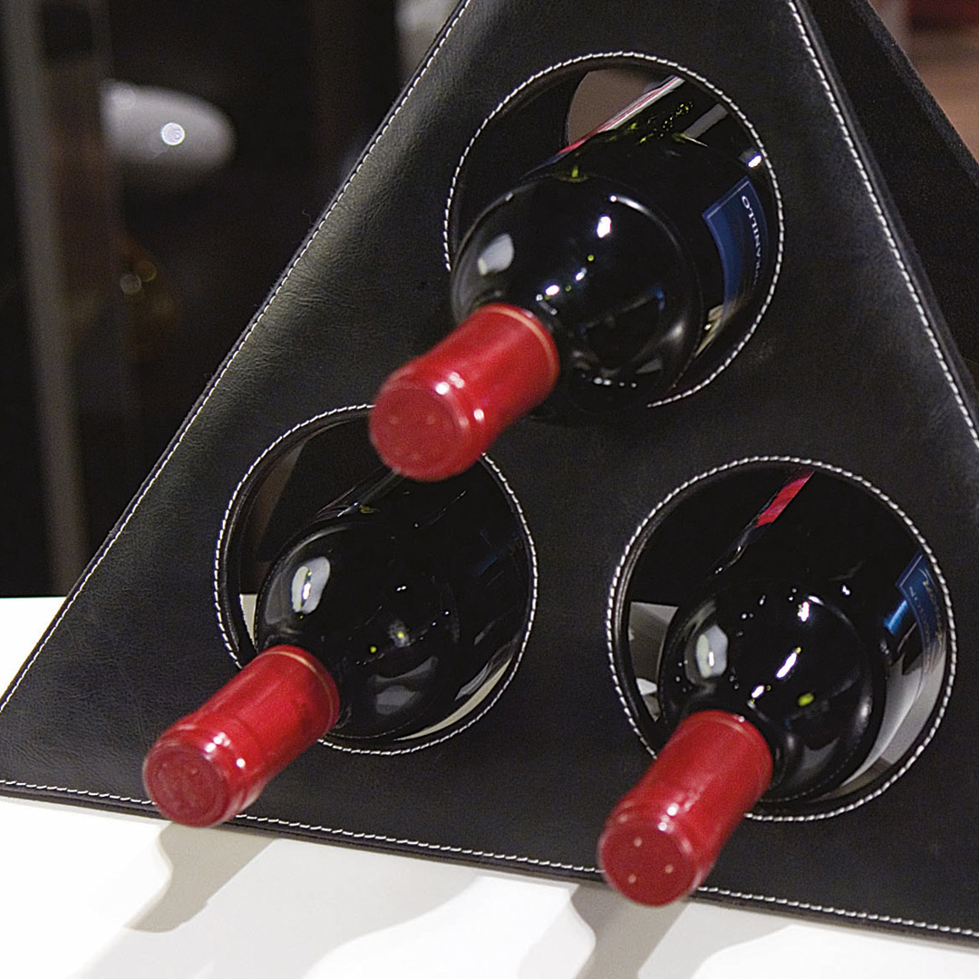 Botellero plegable con capacidad para 3 botellas en elegante polipiel de sobrios colores rosado y tinto. Con pespuntes de refuerzo en color blanco.