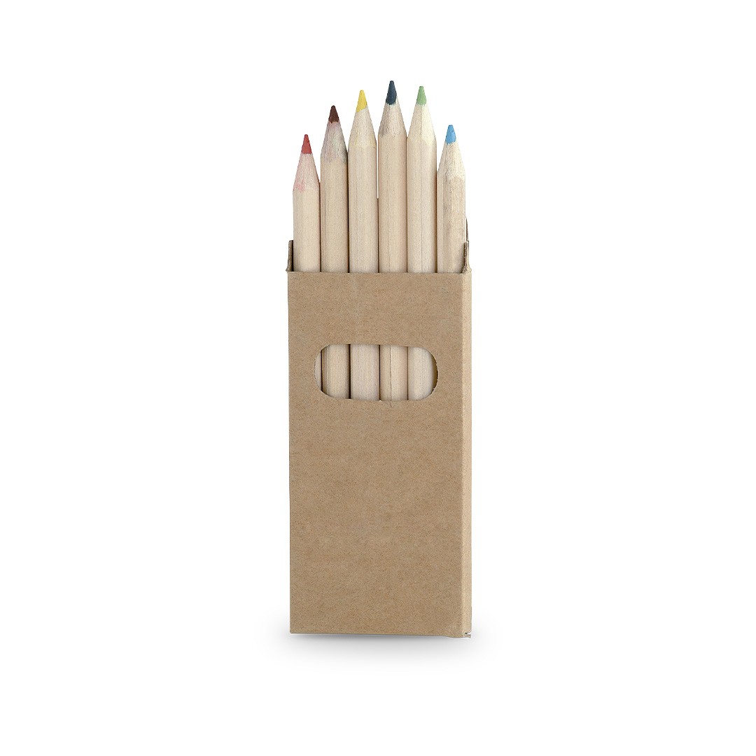 Set de 6 lápices en caja de cartón natural con ventana. Lápices de madera con cuerpo hexagonal de acabado natural y minas en variada gama de colores.