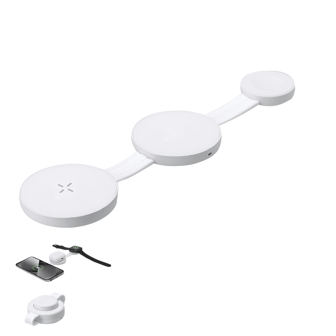 Cargador inalámbrico magnético 3 en 1 de 15W, fabricado en ABS. Diseñado para la carga simultánea del smartphone, auriculares y smartwatch y de tamaño ultra compacto. Un gadget todo en uno: plegable, portátil, muy versátil y de diseño funcional. Conexión por usb Tipo C -cable incluido-.