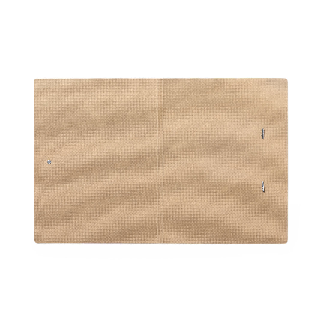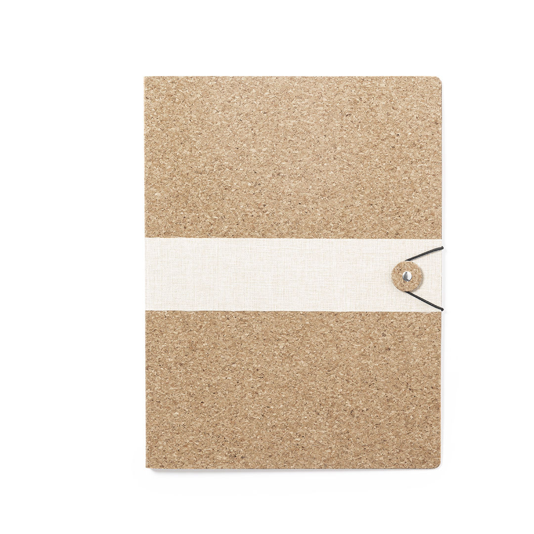 Carpeta de línea nature con exterior en corcho natural y banda central de lino en acabado crudo. Cierre elástico.