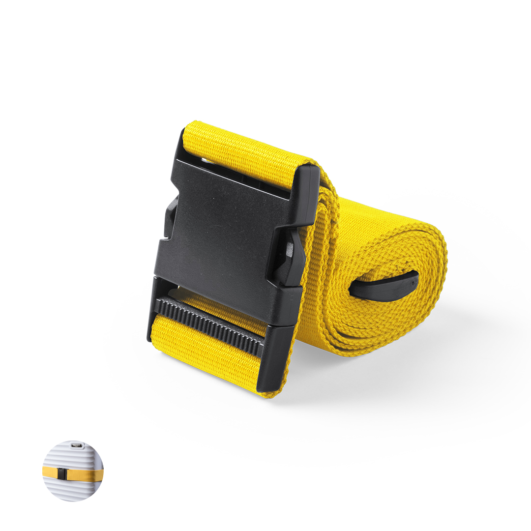 Cinta para maletas de 180cm en resistente poliéster de acabado en vivos colores. Con cierre de clic y accesorio de ajuste.