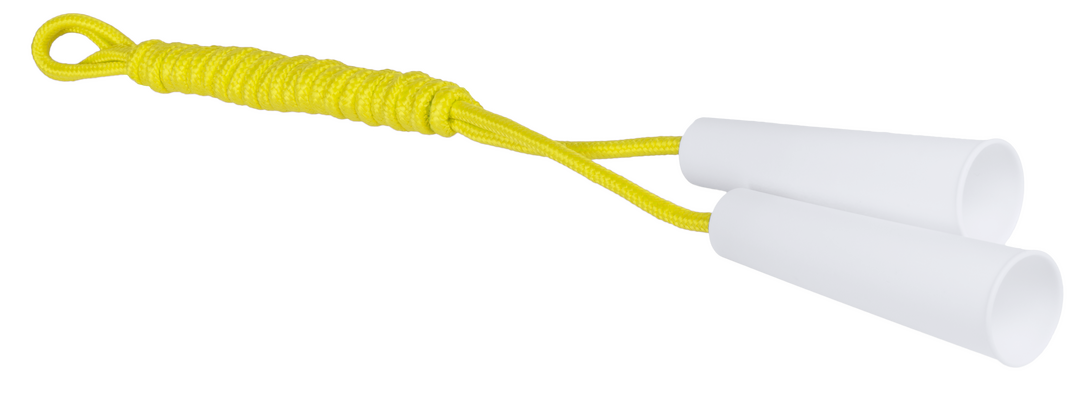 Comba con cuerda extra larga de 240cm de largo en vivos colores y con cómodos mangos de sujeción en color blanco. Presentación plegada.