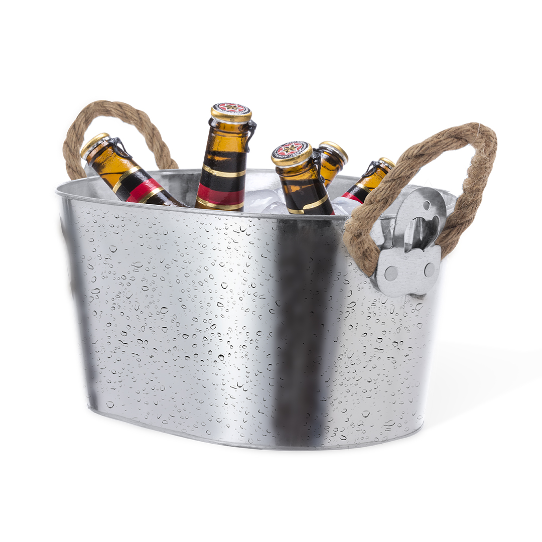 Fantástico cubo metálico de 6l de capacidad para conservar bebidas frías. Fusión perfecta entre estilo y utilidad por sus abridores fijos en los extremos y una gran capacidad. De diseño robusto, con asas de cuerda para fácil transporte.
