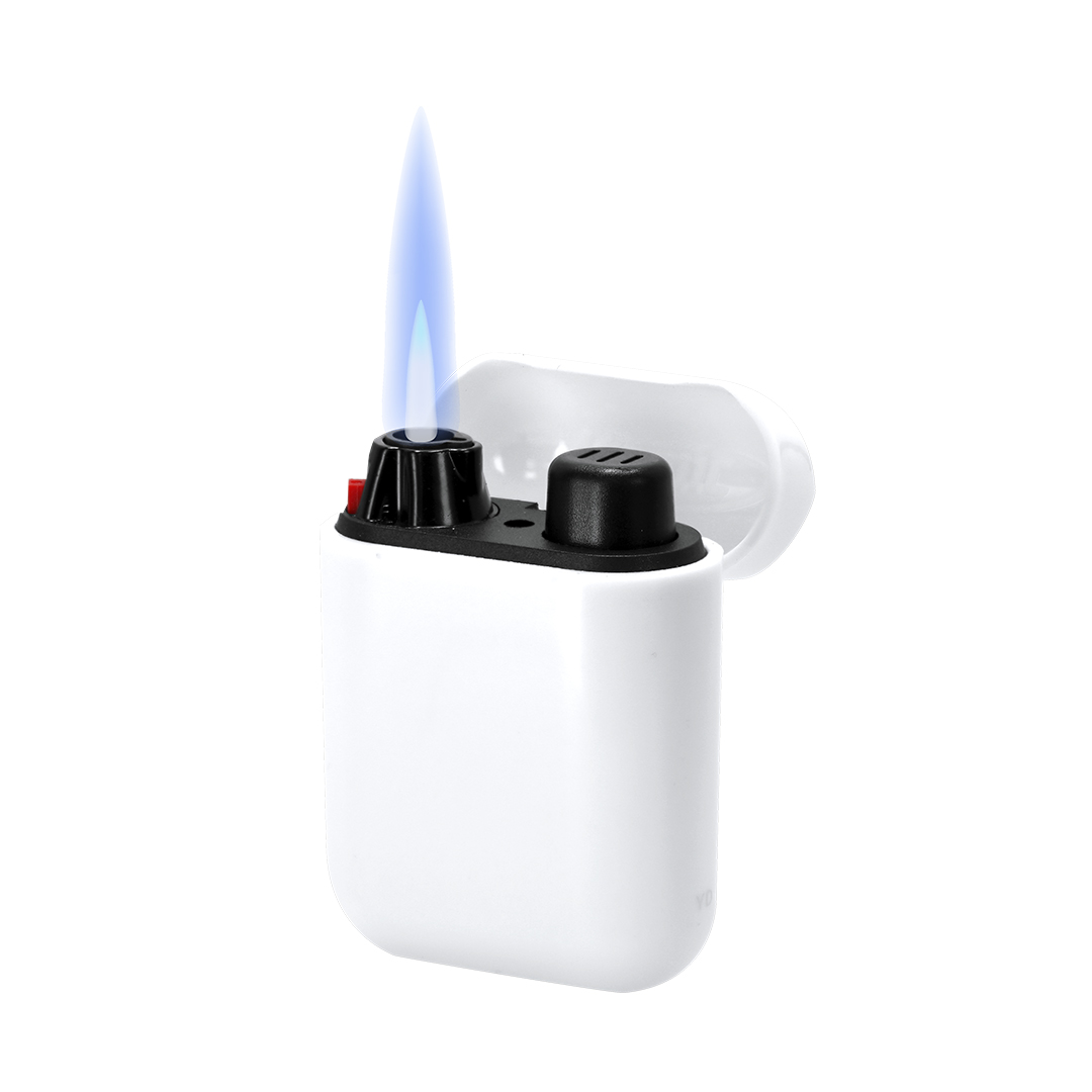 Encendedor a gas recargable. Con diseño original y compacto en blanco con regulador de llama y tapa con cierre.