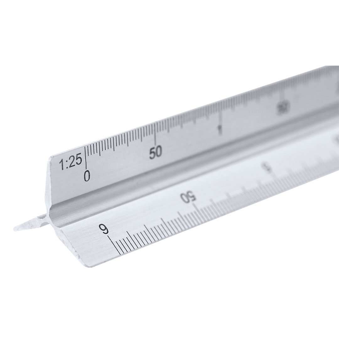 Escalímetro de aluminio en diseño triangular de 30cm. Escalas 1:20/1:25/1:50/1:75/1:100. Con cara lisa para marcaje. Presentado en caja individual.