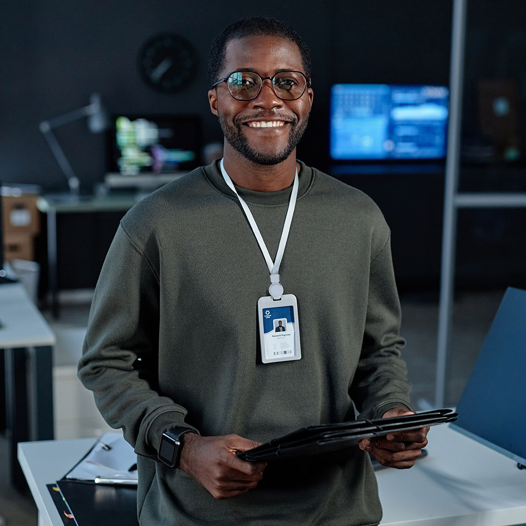 Identificador lanyard extensible. Portatarjetas en ABS desmontable con parte trasera opaca y parte frontal translúcida con enganche en clip. Cuerda extensible de hasta 70 cm y lanyard en poliéster blanco.