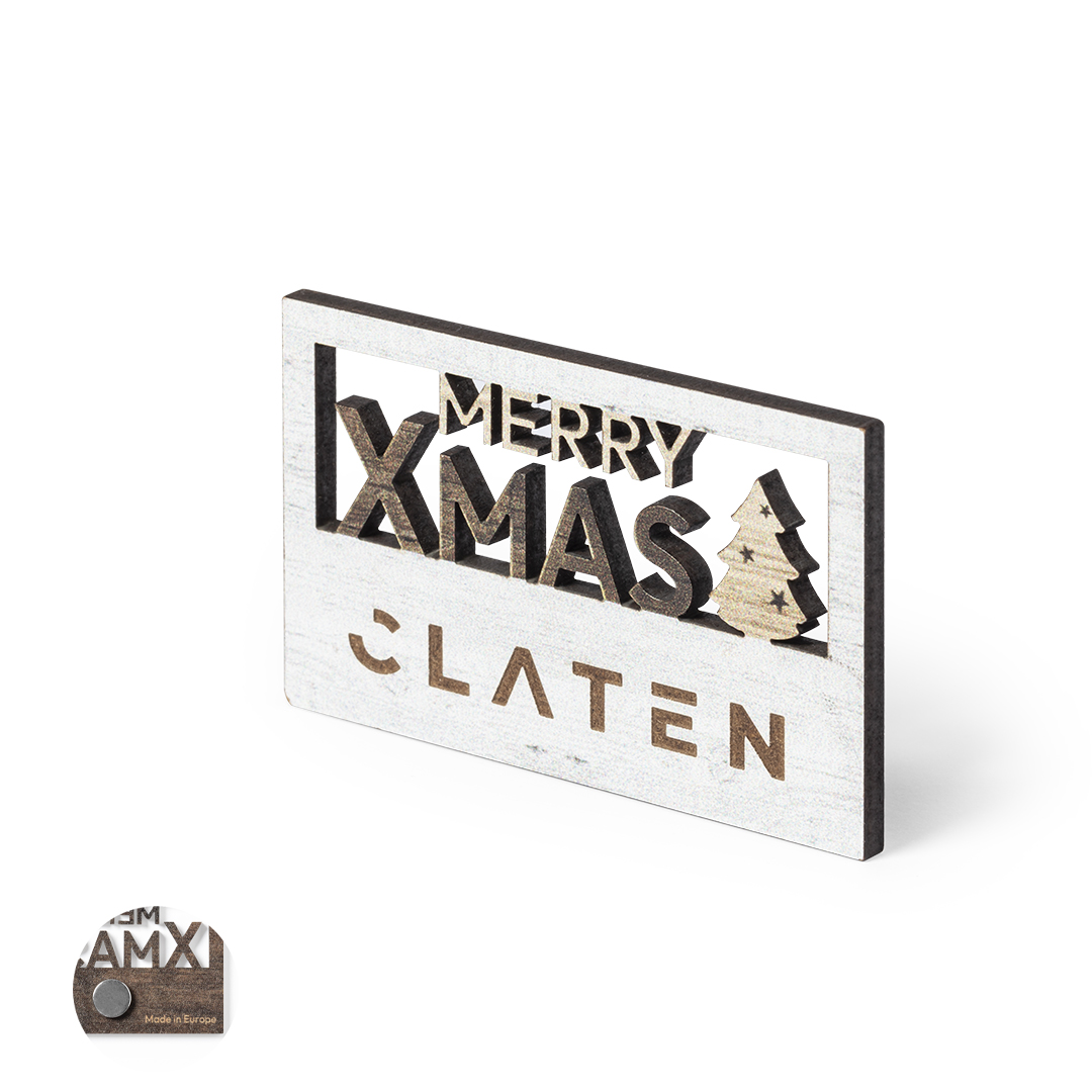 Original imán Merry Christmas fabricado en madera natural, con texto troquelado y de original acabado bicolor. Amplia superficie de marcaje y distintivo Made In Europe.
