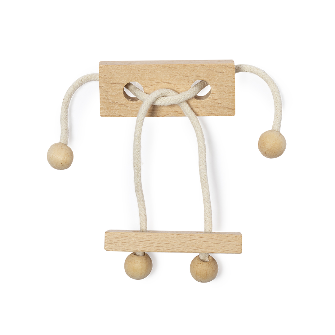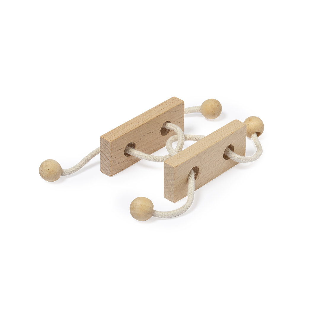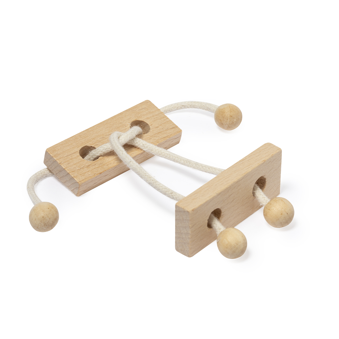 Juego de habilidad de 2 piezas fabricado en madera. Divertido rompecabezas de dos piezas unidas por un cordón de madera, cuyo objetivo es descubrir la forma de separar ambas piezas. Presentado individualmente en una caja de diseño kraft.