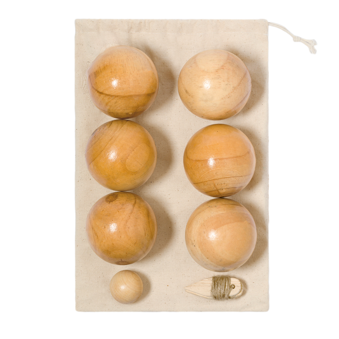 Juego de petanca fabricado en madera. De inspiración artesanal, incluye 6 bolas, un boliche y cuerda de medición. Presentado en una práctica funda de transporte fabricada en algodón de acabado natural y con cierre de cordón.