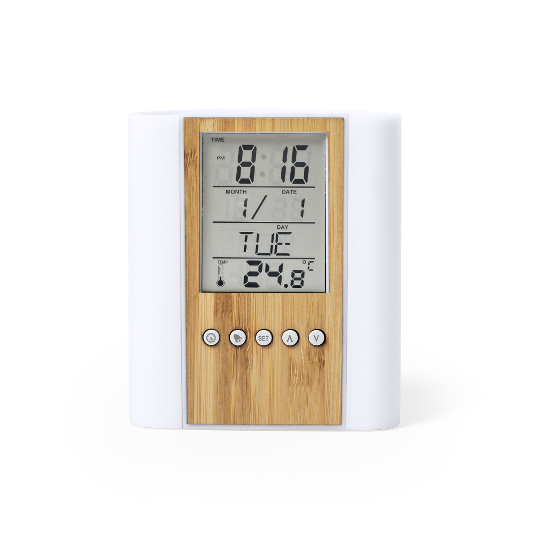 Lapicero de línea nature con reloj multifunción integrado. Fabricado en combinación de materiales bambú y ABS. Funciones termómetro, calendario y alarma temporizador y recordatorio de cumpleaños. Alimentación a pilas (de botón incluidas) y presentado en atractiva caja de diseño eco. Disponible manual de instrucciones en español e inglés.
