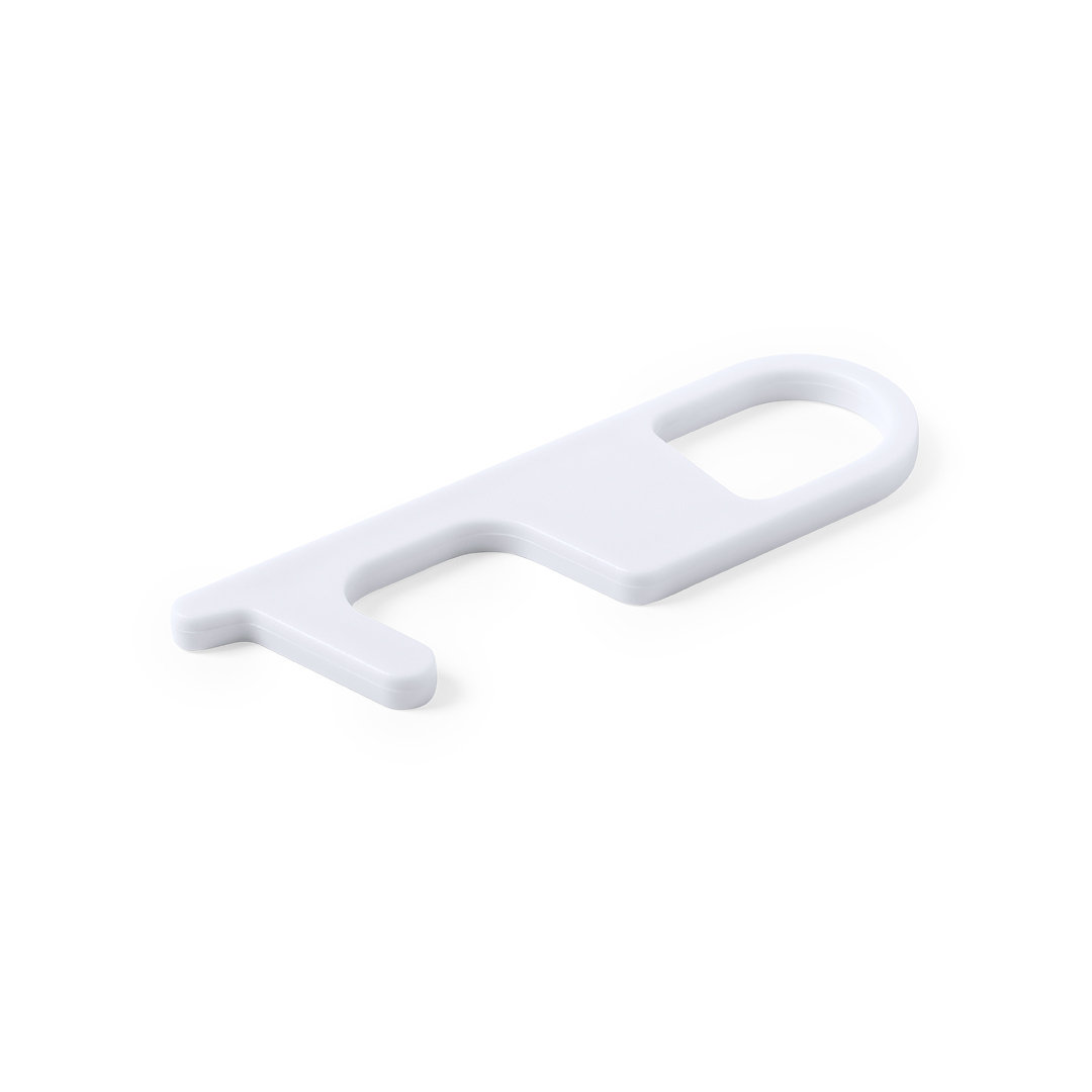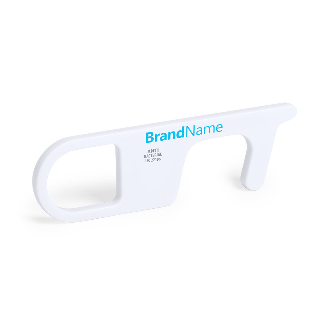 Llavero higiénico antibacteriano y anti-contacto, fabricado en resistente ABS de acabado sólido. Especialmente diseñado para evitar tocar con las manos superficies de uso común (picaportes de puertas, interruptores, grifos de uso público, cajeros automáticos…). Con cómodo troquel para el dedo y presentado en bolsita individual. Recomendado para marcaje en tampografía.Los productos con tratamientos antibacterianos son capaces de reducir drásticamente las cargas bacterianas presentes en las superficies de los materiales, gracias a la incorporación de agentes microbianos permanentes estáticos, con alta efectividad para inhibir y prevenir la contaminación bacteriana.Artículo de acuerdo al estándar ISO 22196, que determina la actividad antibacteriana en materiales plásticos y superficies no porosas, lo que permite conocer la efectividad de inhibición microbiana que tienen los aditivos sobre los objetos tratados mediante una evaluación cuantitativa.