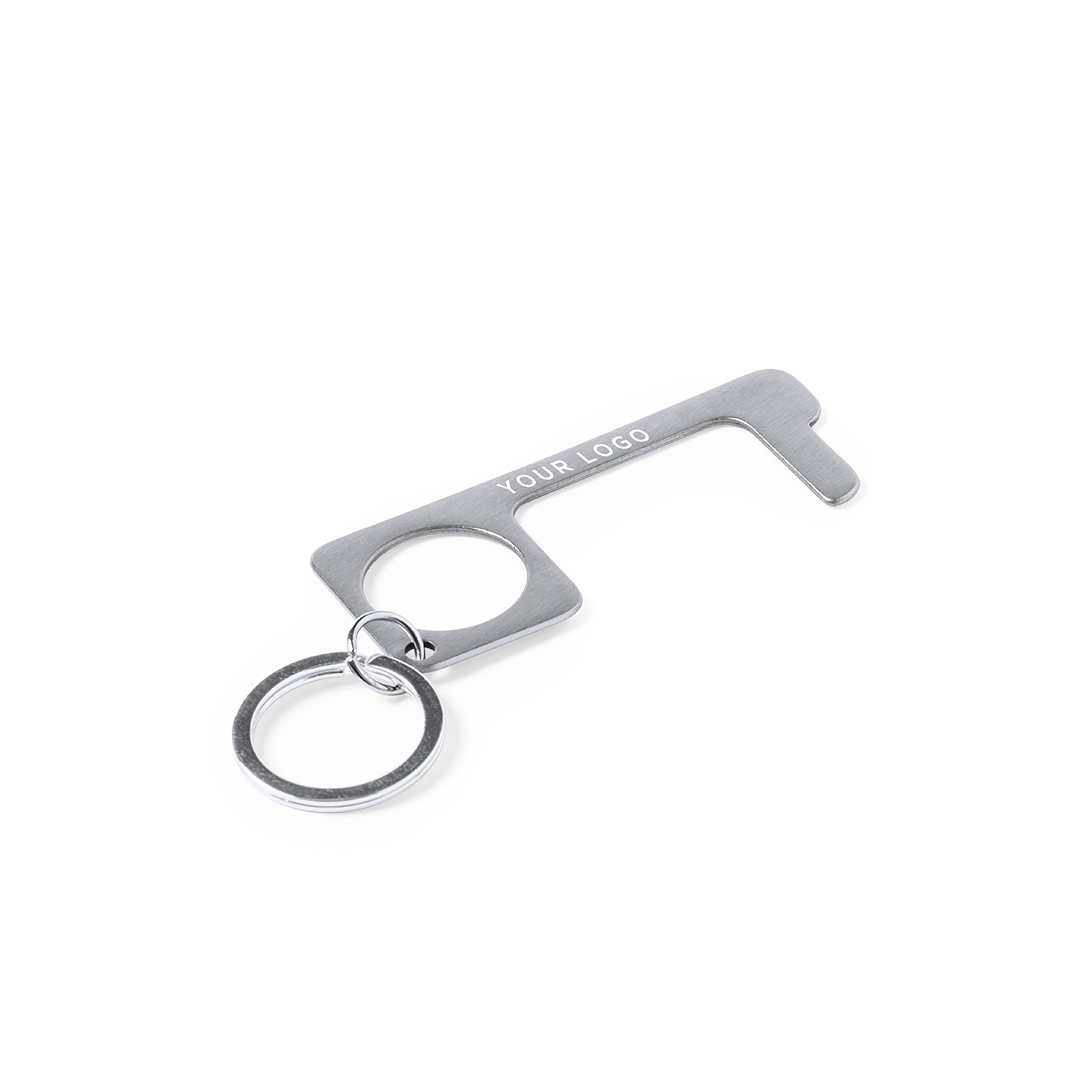 Llavero higiénico anti-contacto, fabricado en resistente acero inox. Especialmente diseñado para evitar tocar con las manos superficies de uso común (picaportes de puertas, interruptores, grifos de uso público, cajeros automáticos…). Con cómodo troquel para el dedo y presentado en bolsita individual. Recomendado para marcaje en láser.