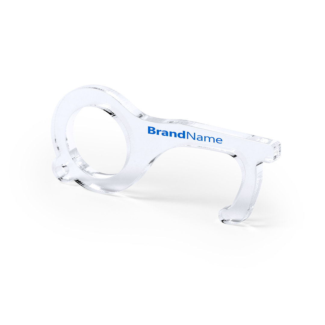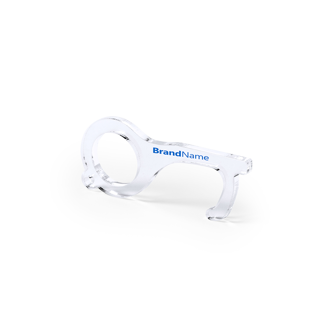 Llavero higiénico anti-contacto, fabricado en original y resistente material acrílico de acabado transparente. Especialmente diseñado para evitar tocar con las manos superficies de uso común (picaportes de puertas, interruptores, grifos de uso público, cajeros automáticos…). Con cómodo troquel para el dedo y presentado en bolsa individual de diseño. Recomendado para marcaje en tampografía.