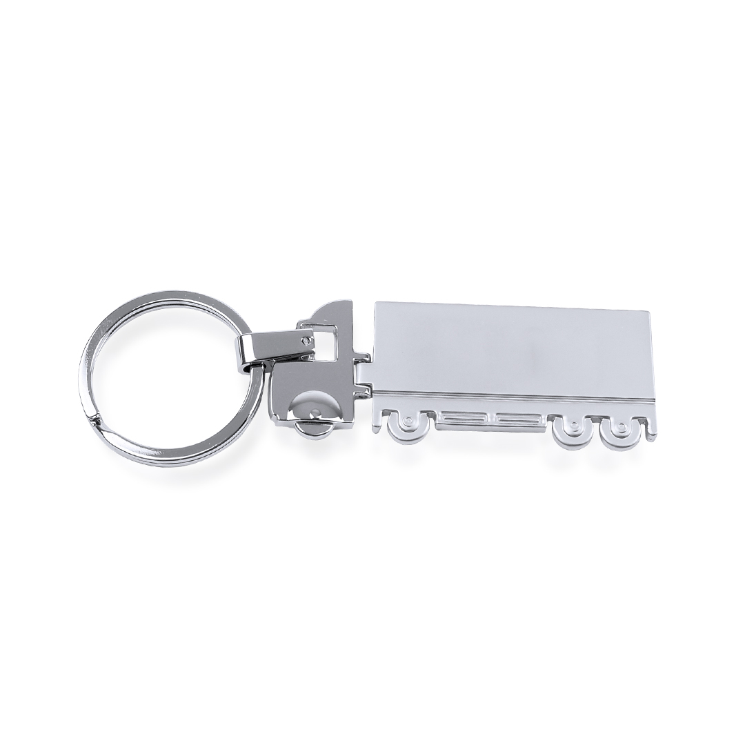 Llavero metálico en divertido diseño de camión especialmente diseñado para marcaje en láser. Con cabina en acabado brillo y remolque en acabado mate.