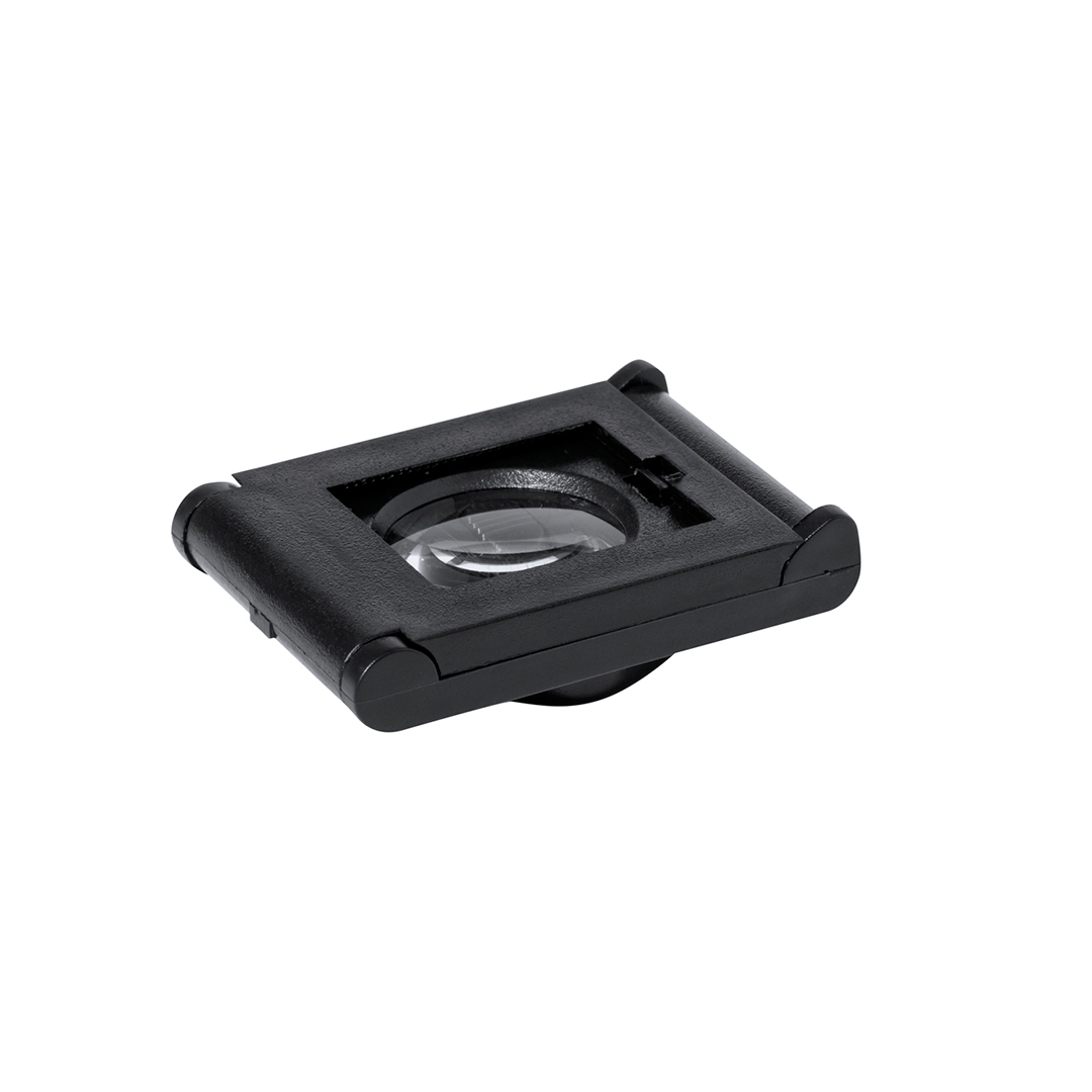 Lupa plegable de 8 aumentos fabricada en resistente PP, con luz LED integrada y regla de medición, Alimentada con pila de botón (incluida) y presentada en caja individual negra de cartón negro.
