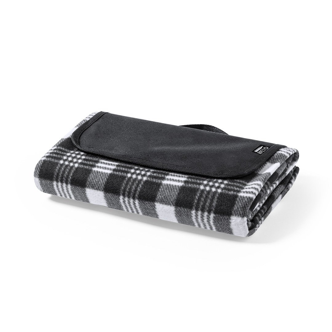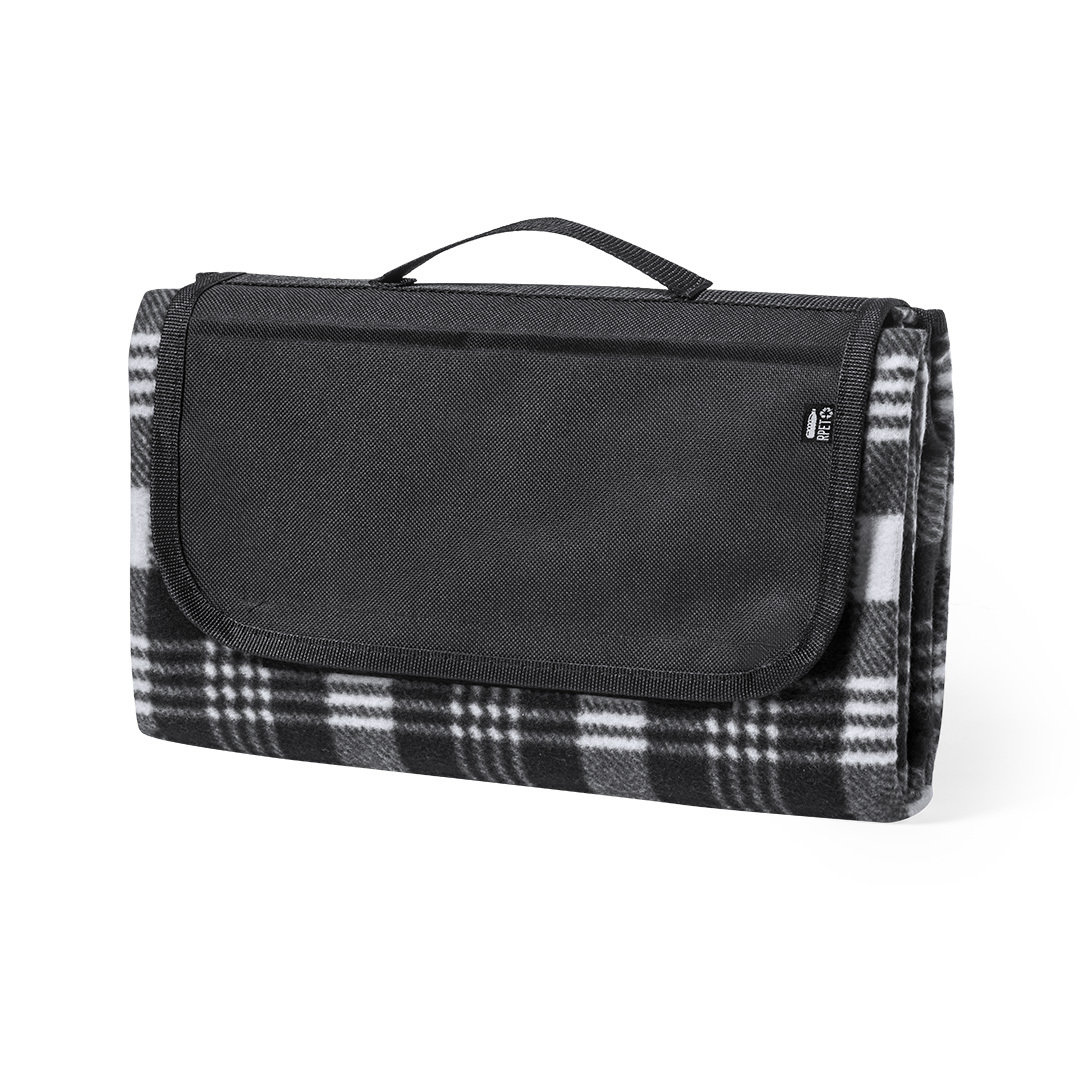 Manta de picnic de calidad premium, fabricada en poliéster RPET de 160g/m2, elaborado a partir de plástico reciclado para así fomentar la reutilización de residuos plásticos y contribuir a la sostenibilidad del planeta. Medidas 120x150cm, con lado para sentarse en patrón tartán bicolor de suave tacto. Lado en contacto con el suelo en resistente PEVA. De fácil plegado y de tamaño compacto, incluye asa de transporte y solapa con cierre de velcro, con distintivo RPET en etiqueta.