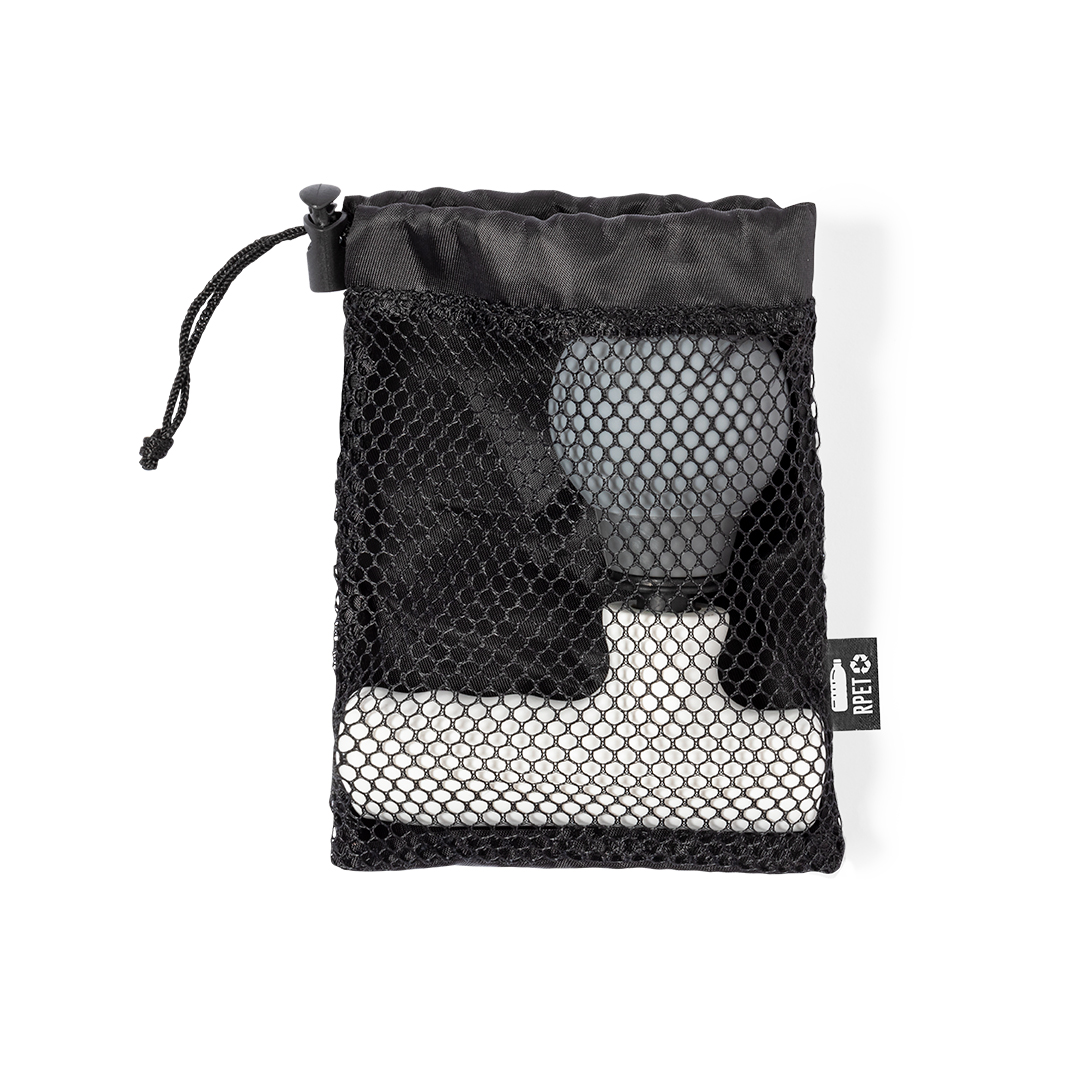 Masajeador eléctrico. Ayuda a relajar los músculos, aliviar los efectos del entrenamiento, liberar tensión y revitalizar el cuerpo. Con dos posiciones de intensidad. Batería recargable de larga duración de 800 mAh – cable USB incluido-. Con manual de uso en español e inglés. Presentado en funda de poliéster RPET con cierre de cordón, elaborada a partir de plástico reciclado para así fomentar la reutilización de residuos plásticos y contribuir a la sostenibilidad del planeta. Etiqueta distintiva RPET en la funda.