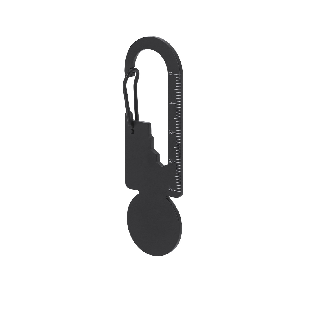 Multiherramienta de acero inoxidable y acabado negro mate. Diseñada para adaptarse a múltiples necesidades, incluye 8 funciones: llave para tuercas hexagonales en varios tamaños, regla para mediciones, abrebotellas, moneda para carro de compra, etc. Con cierre de mosquetón.