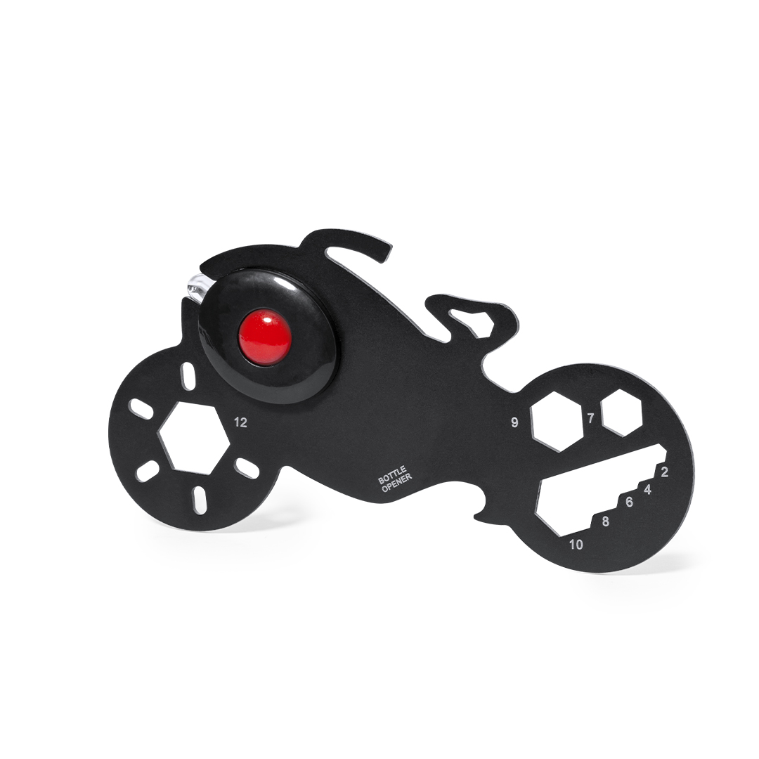 Original y práctica multiherramienta en acero inox con forma de motocicleta. Con 11 funciones, entre otras: llave para tuercas hexagonales en varios tamaños y abrebotellas. Además, con linterna de 1 LED alimentada por pila de botón. Presentado en bolsa de papel reciclada.