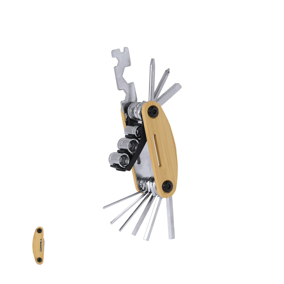 Multiherramienta en resistente acero inox con carcasa de bambú. Con 15 funciones:- Llaves Allen- Llaves Hexagonales- Destornillador plano- Destornillador estrella- Destornillador Phillips- Adaptador de tubo para tuercas hexagonales – Llaves de vasoMateriales como el bambú fomentan la utilización de materias primas naturales, reduciendo las emisiones contaminantes. Proviene de una planta de gran resistencia y versatilidad, con crecimiento y regeneración rápidos, siendo una excelente alternativa al uso de madera tradicional.
