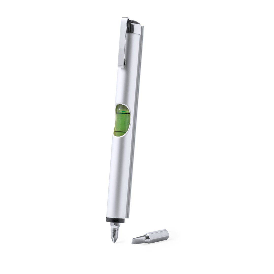 Práctica multiherramienta fabricada en aluminio, con nivel integrado en el cuerpo y dos cabezales para destornillador (plano y philips) en el interior. Con clip metálico de acabado cromado y presentada en caja de diseño kraft.