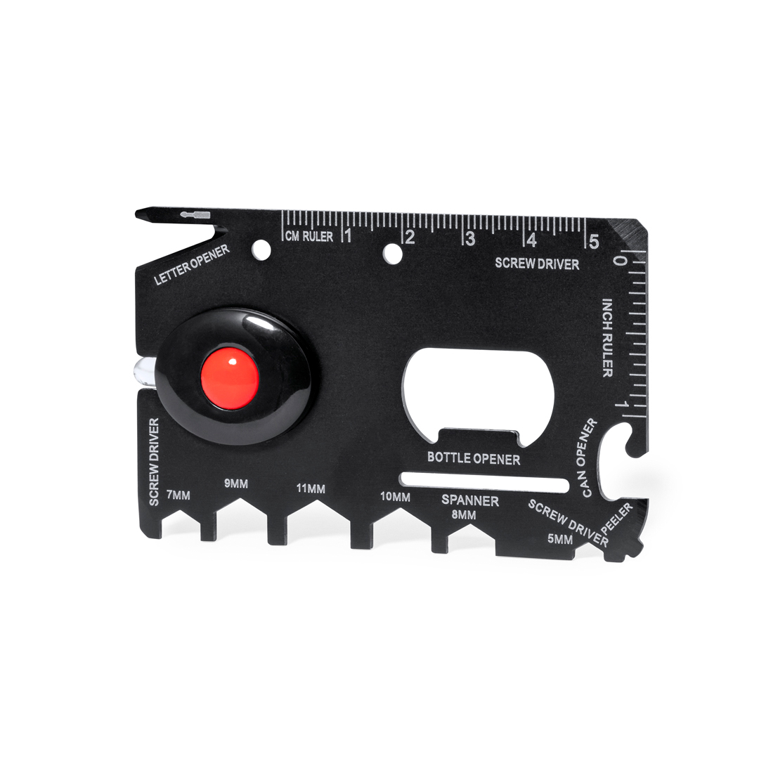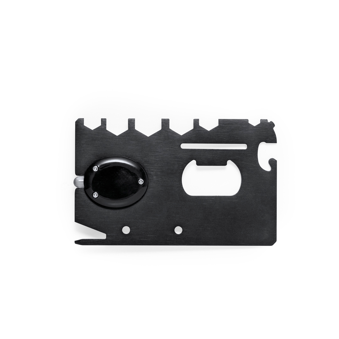 Práctica multiherramienta fabricada en acero inox y acabado en negro. Diseño plano en forma de tarjeta y con 16 funciones: destornilladores planos, abridor de cartas, regla en cm y pulgadas, abridor de botellas, abrelatas, pelador, llave para tuercas hexagonales en varios tamaños y linterna (pila de botón incluida). Presentada en bolsa individual diseño en papel reciclado.