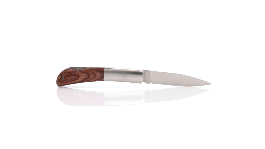 Navaja con hoja en acero inox y empuñadura en combinación de madera natural con acero inox. Con bloqueo de seguridad, troquelado en mango y presentada en caja individual.