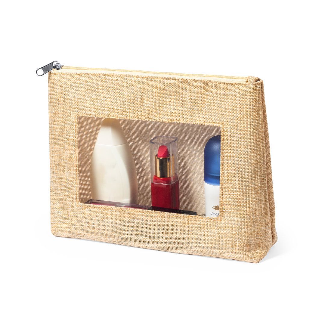 Neceser de inspiración nature con ventana en un lado. Con cierre de cremallera a juego y de acabado cosido. Fabricado en poliéster de tono crudo, con ventana en EVA transparente.