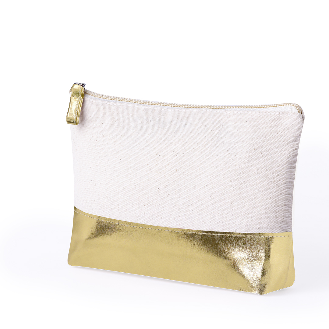 Neceser en material 100% algodón reciclado de 220 g/m2. Con cierre de cremallera a juego con la base. Disponible en color natural con base de color metalizado en polipiel.